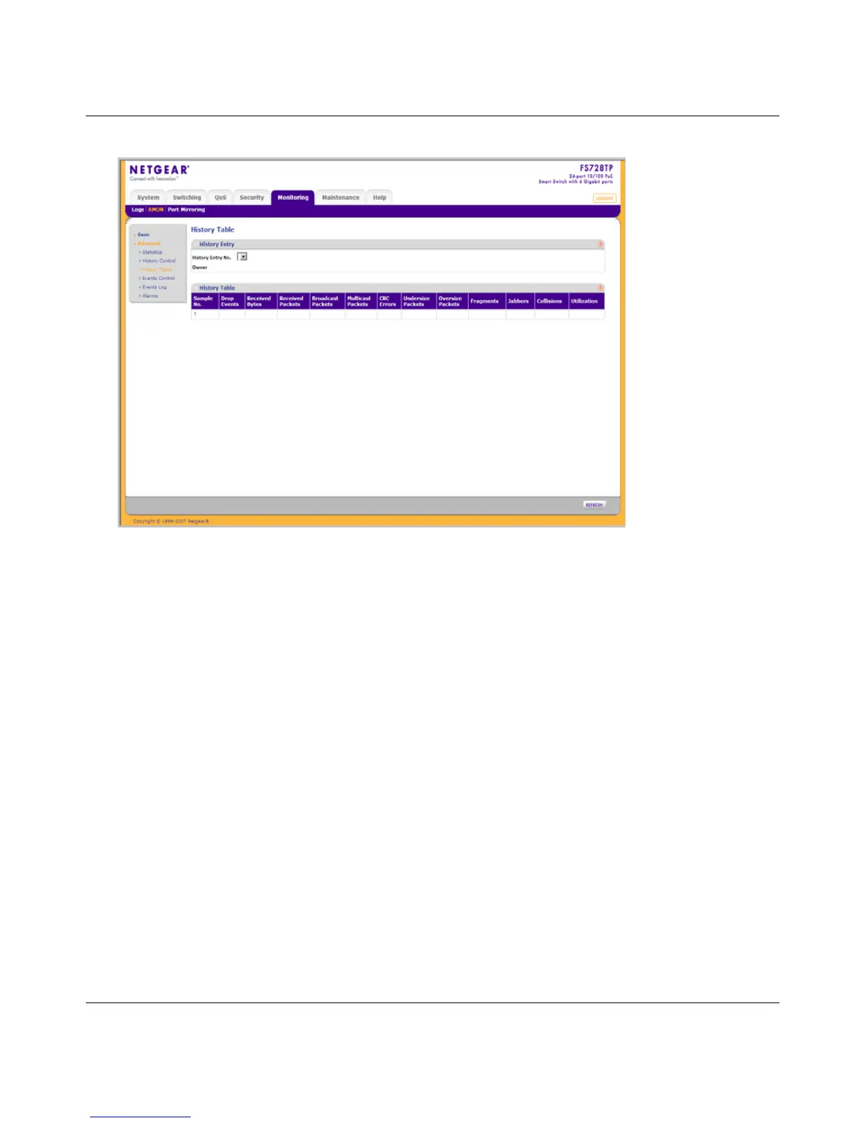 The RMON History Table screen contains the following fields: