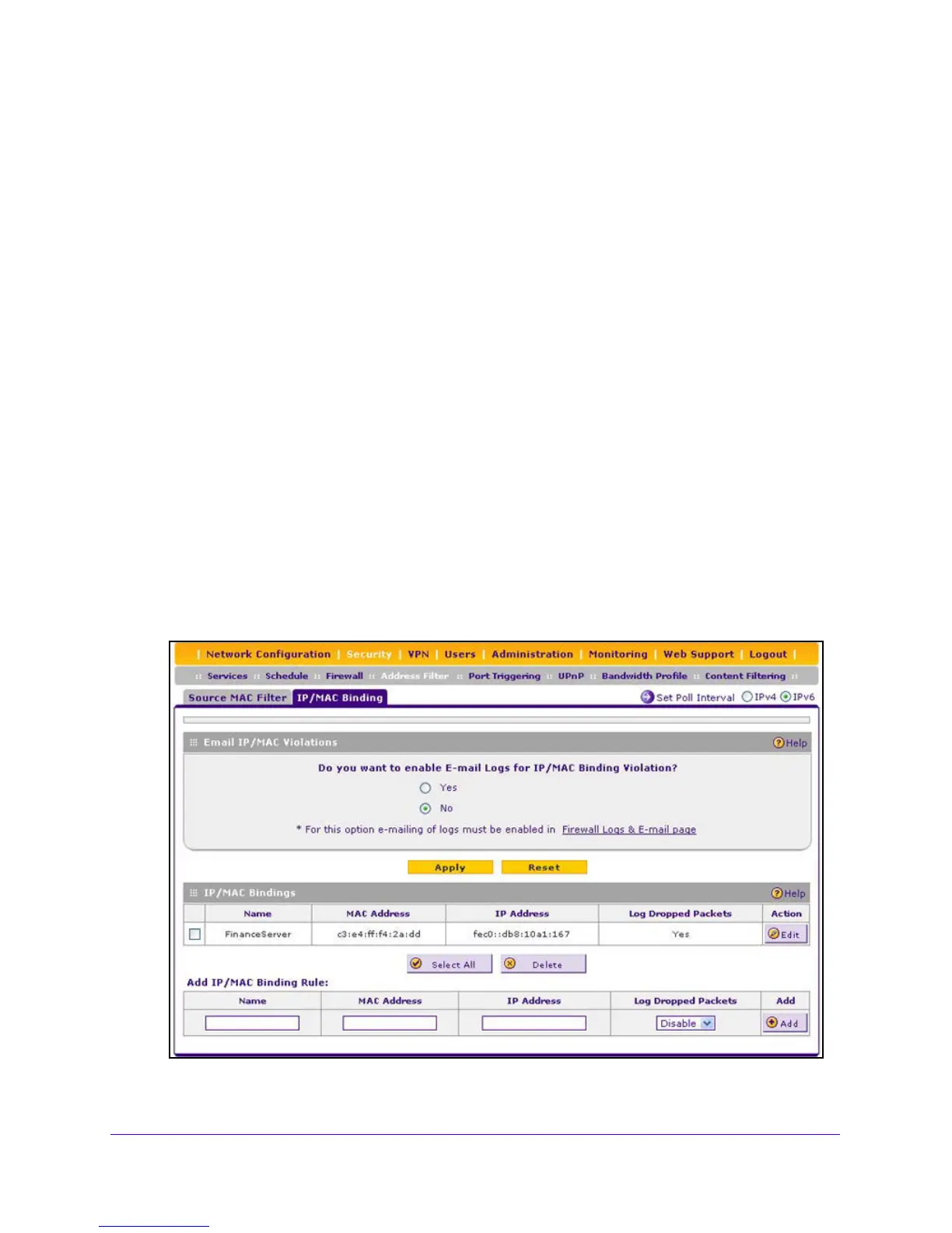 The IP/MAC Binding screen displays.