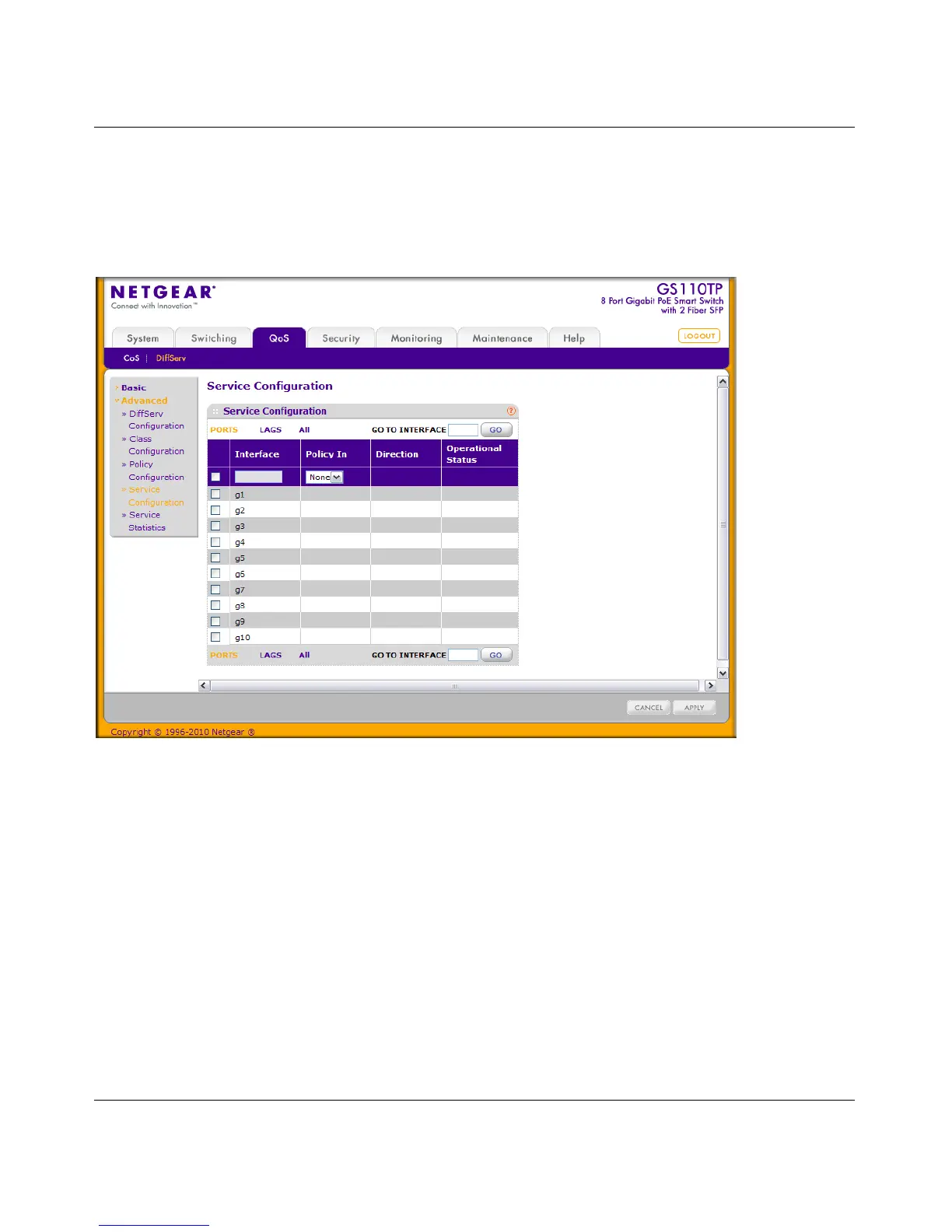 To display the page, click QoS DiffServ Advanced Service Configuration.