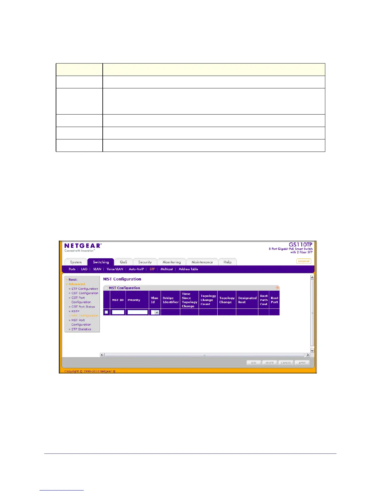 To display the Spanning Tree MST Configuration page, click Switching > STP > Advanced