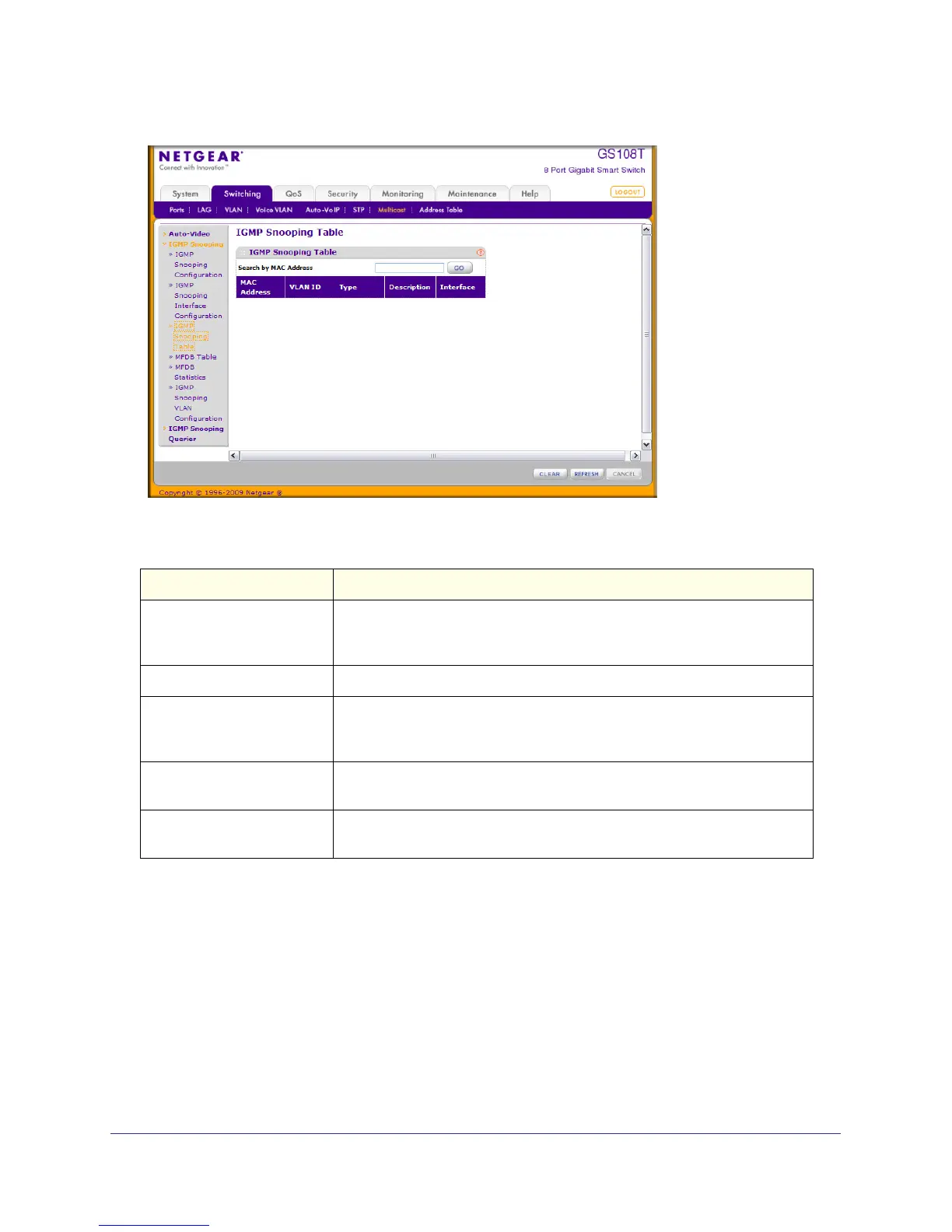 The following table describes the fields in the IGMP Snooping Table.