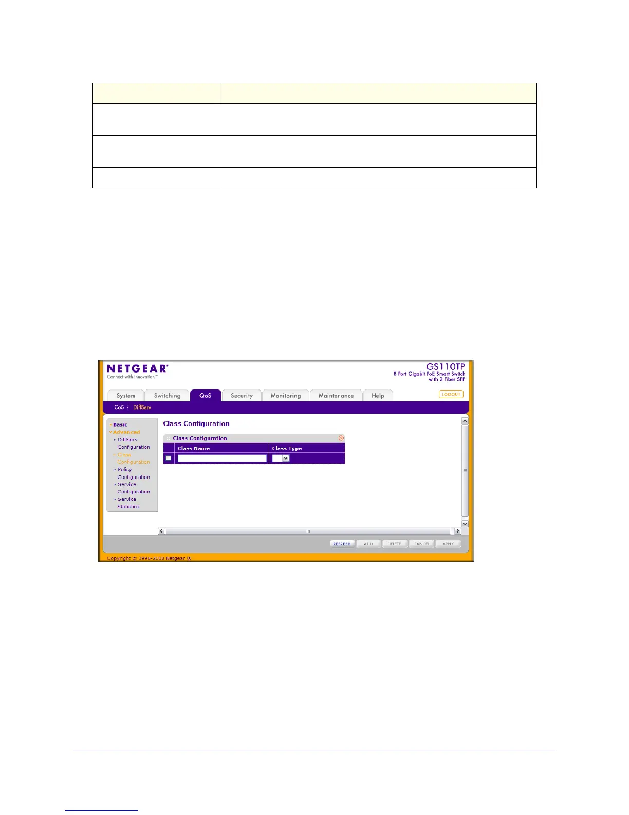 Use the Class Configuration page to add a new DiffServ class name, or to rename or delete