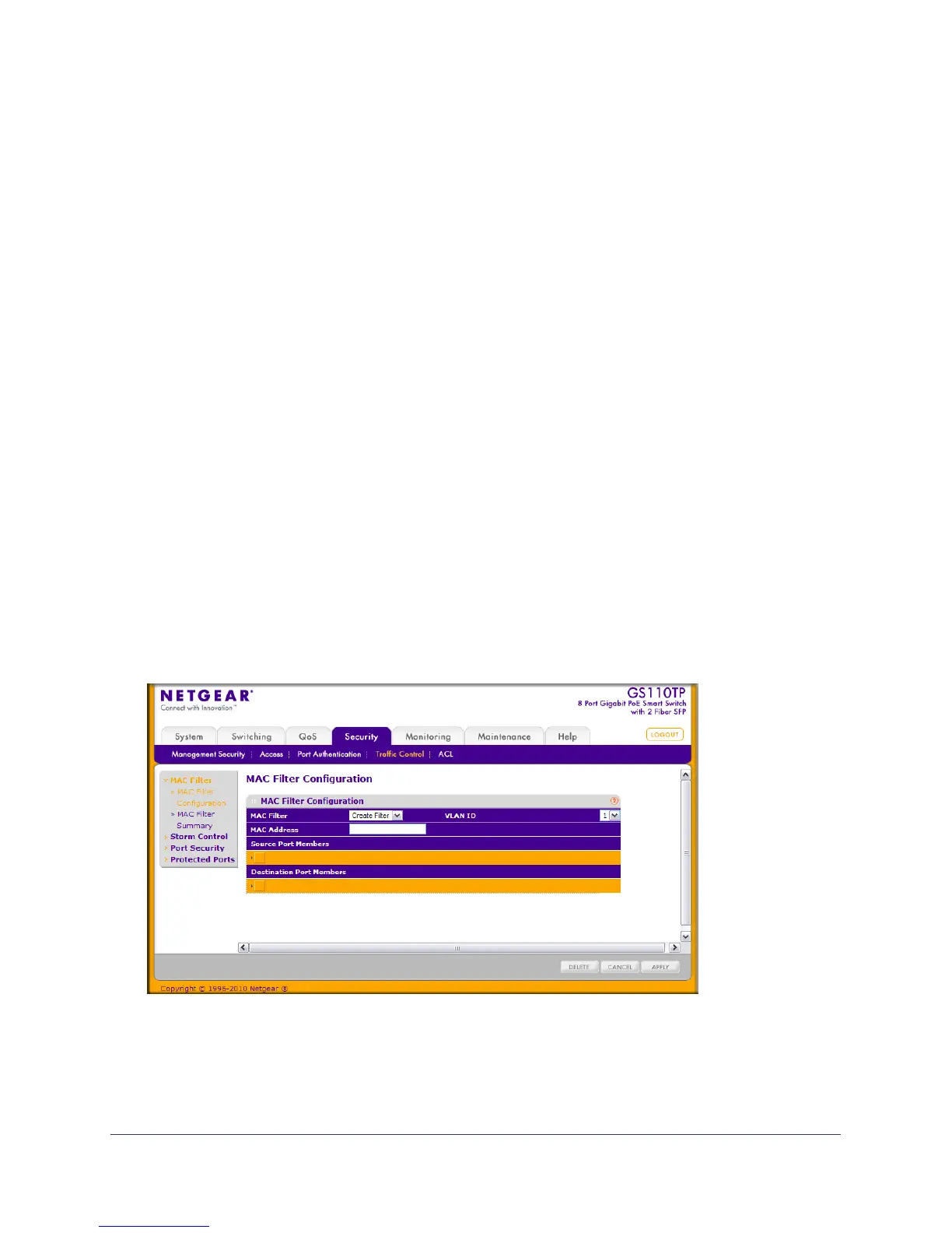 From the Traffic Control link, you can configure MAC Filters, Storm Control, Port Security,