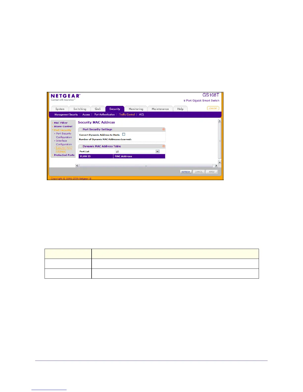 To display the Security MAC Address page, click Security Traffic Control, and then click