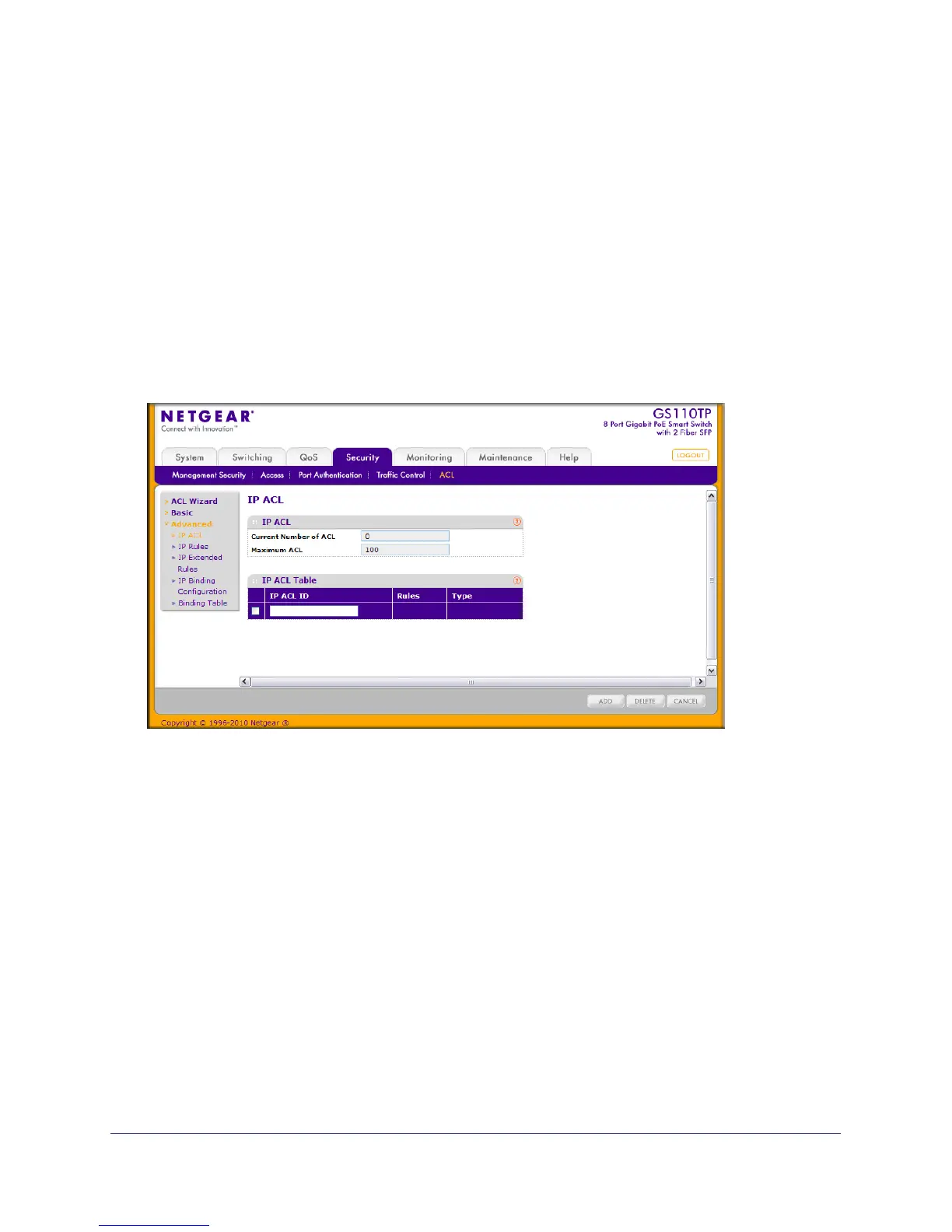 To display the IP ACL page, click Security ACL, then click the Advanced IP ACL link.