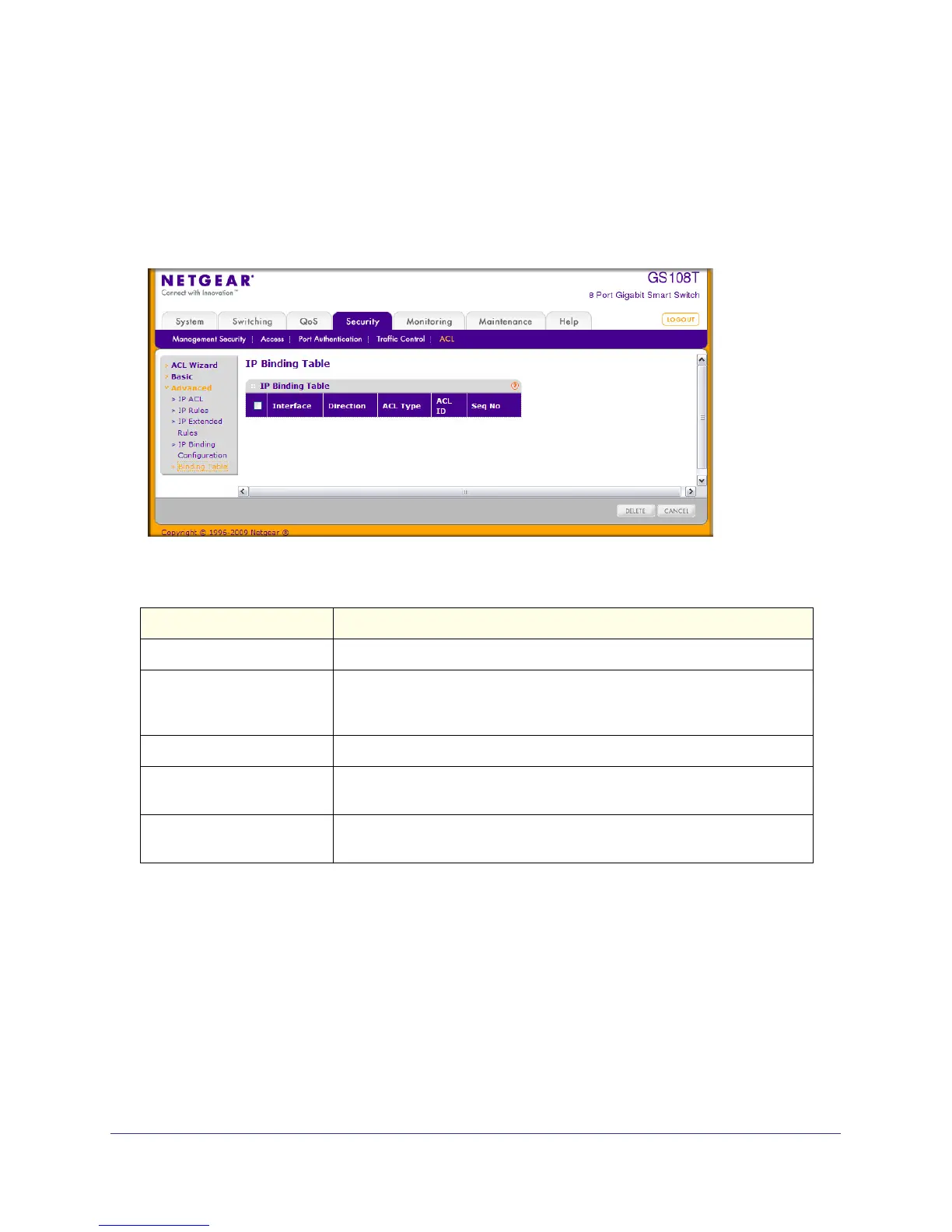 Use the IP Binding Table page to view or delete the IP ACL bindings.