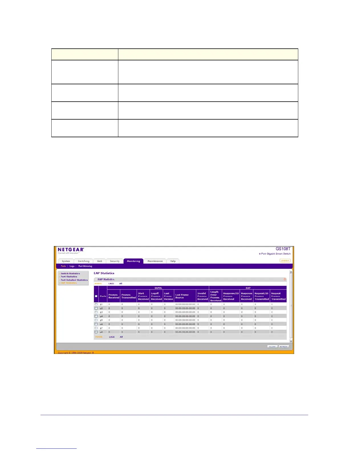 To display the EAP Statistics page, click the Monitoring Ports tab, and then click the EAP