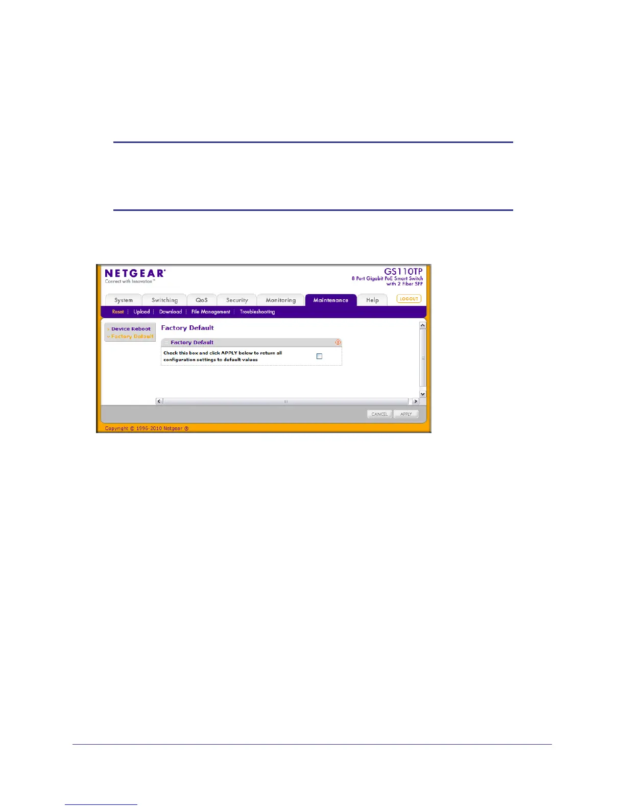 To access the Factory Defaults page, click Maintenance Reset Factory Default.
