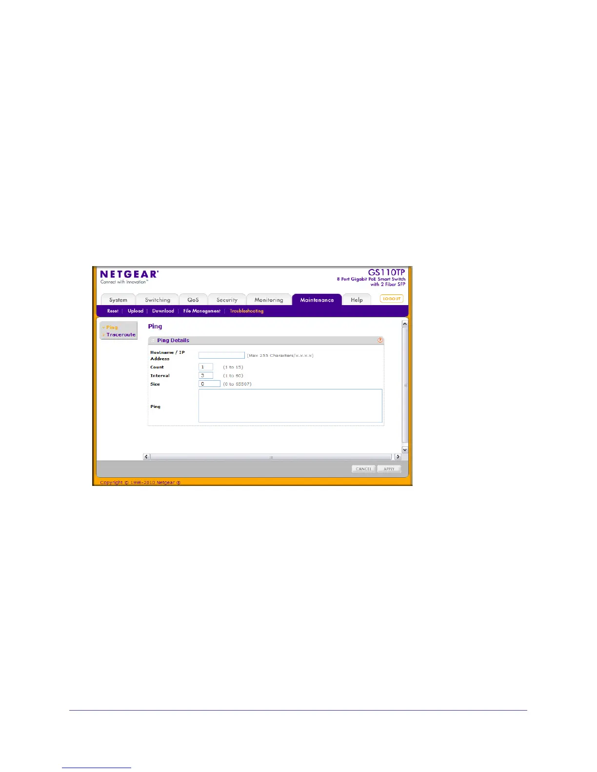 To access the Ping page, click Maintenance Troubleshooting Ping.