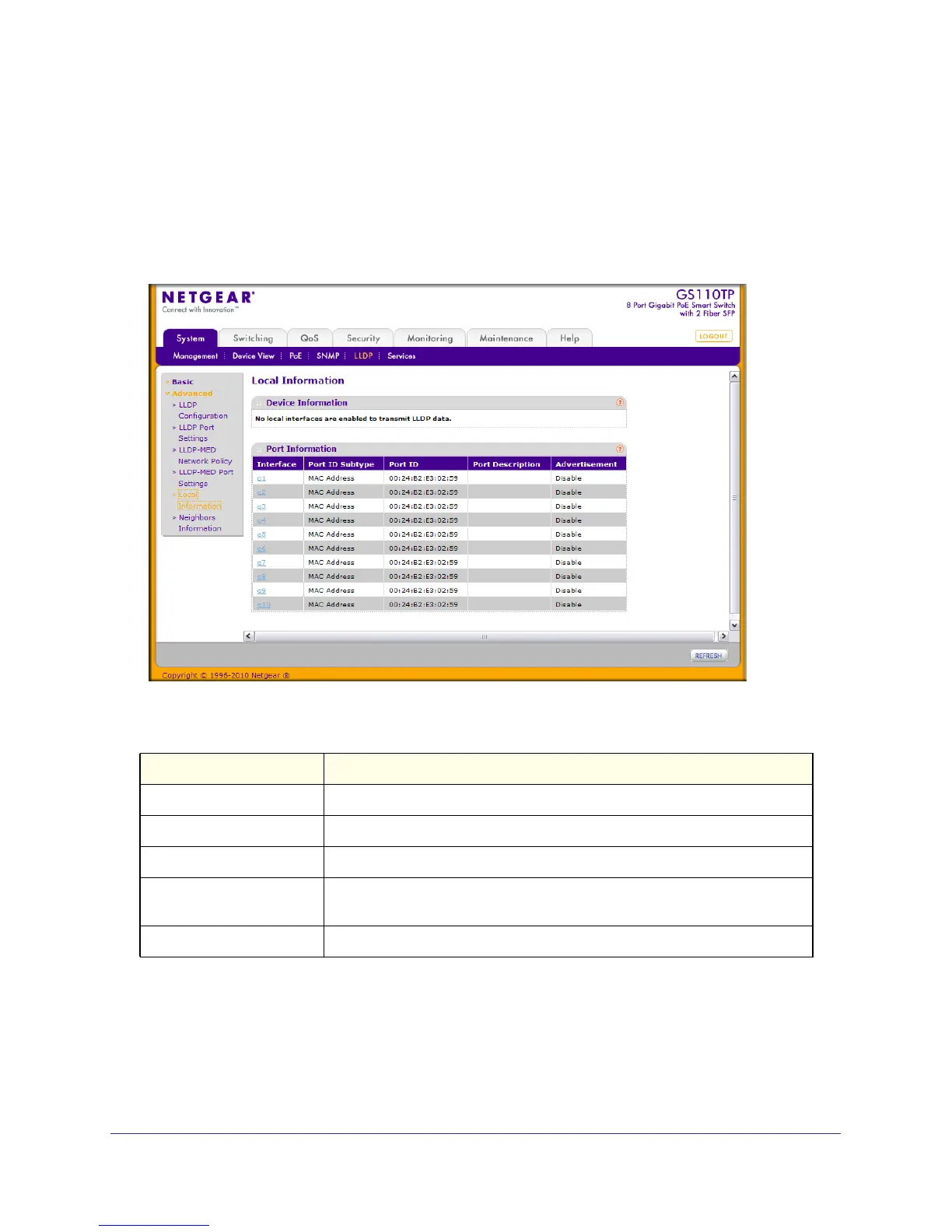 To display the LLDP Local Device Information page, click SystemAdvanced LLDP