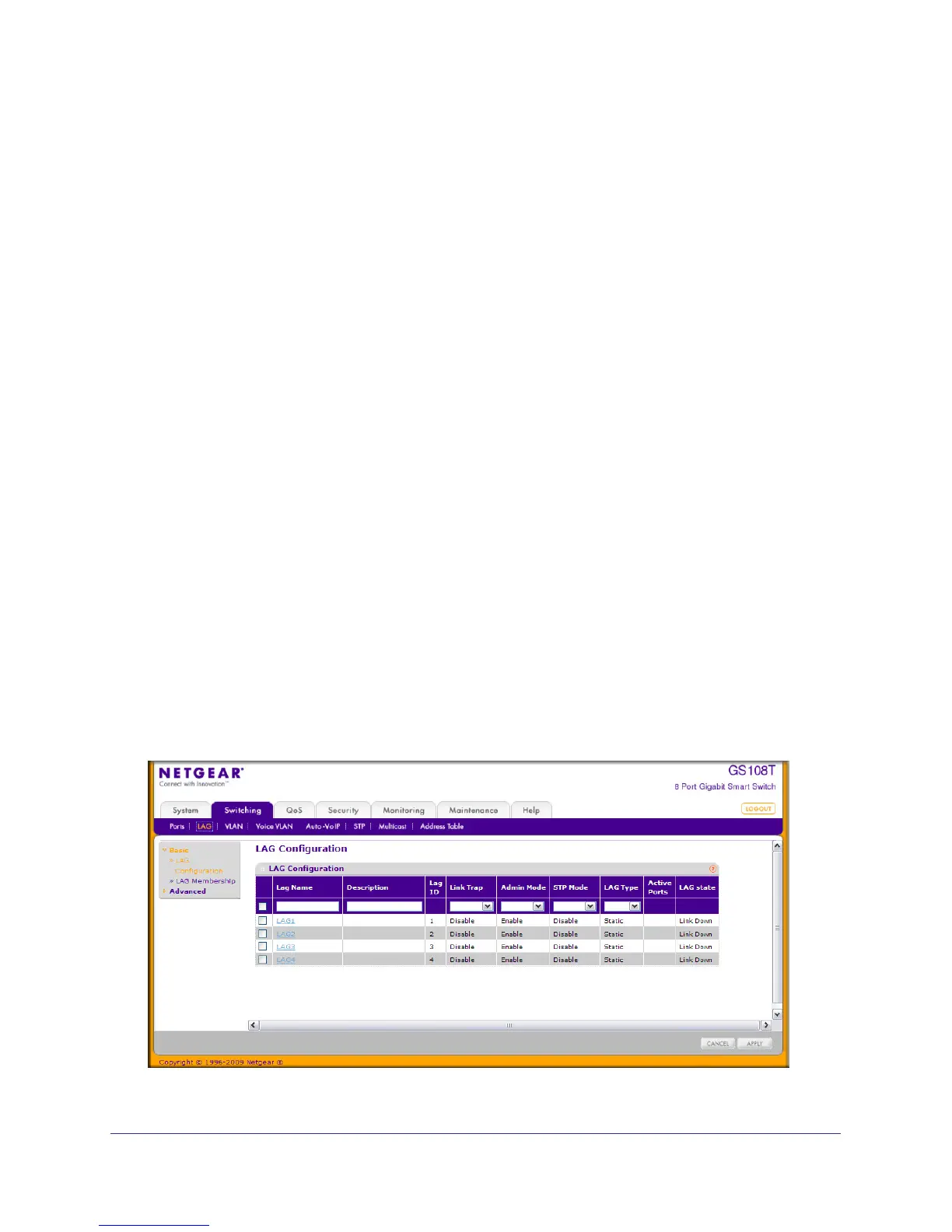 To access the LAG Configuration page, click Switching LAG Basic LAG Configuration.
