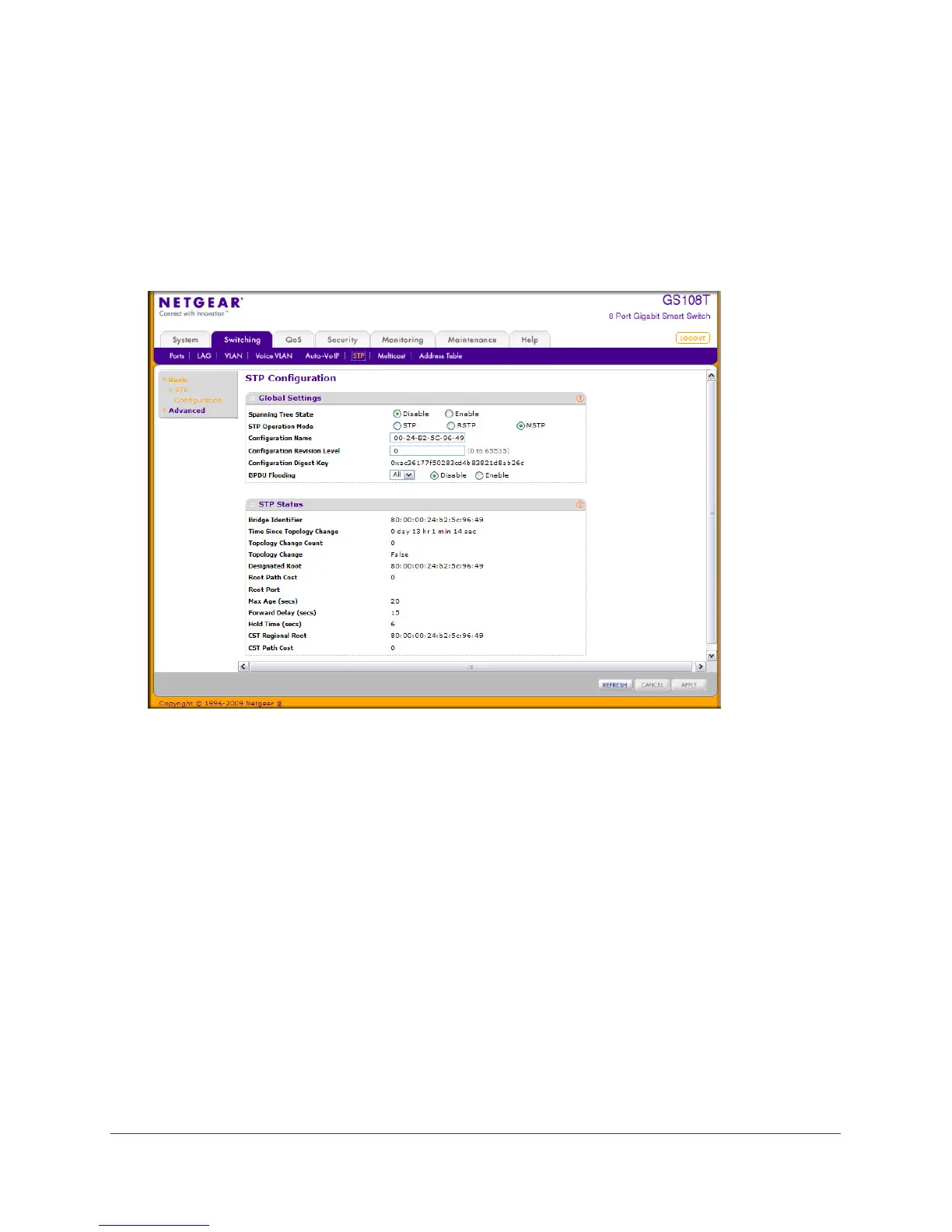 To display the Spanning Tree Switch Configuration/Status page, click Switching > STP >