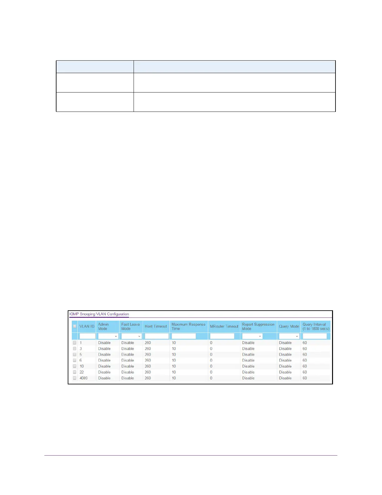 • Admin Mode. Enable or disable IGMP snooping for the specified VLAN ID. The