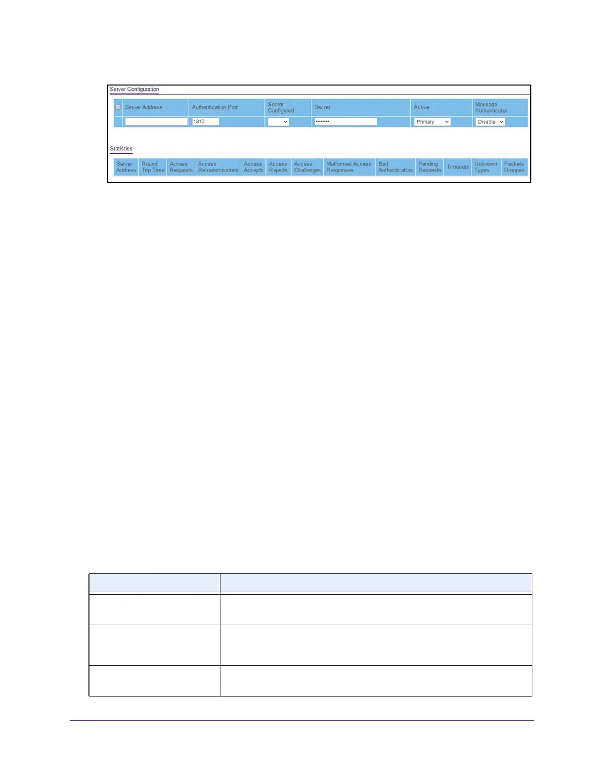 Server Address The address of the RADIUS server or the name of the RADIUS server for