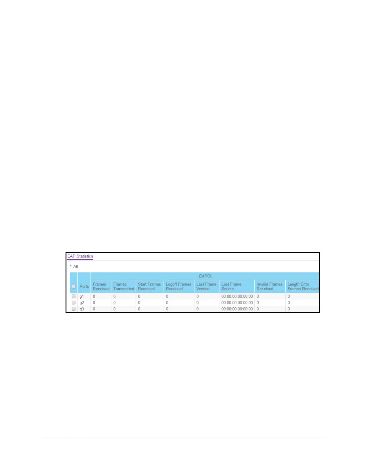o clear all the EAP counters for all ports on the switch, select the check box in the row