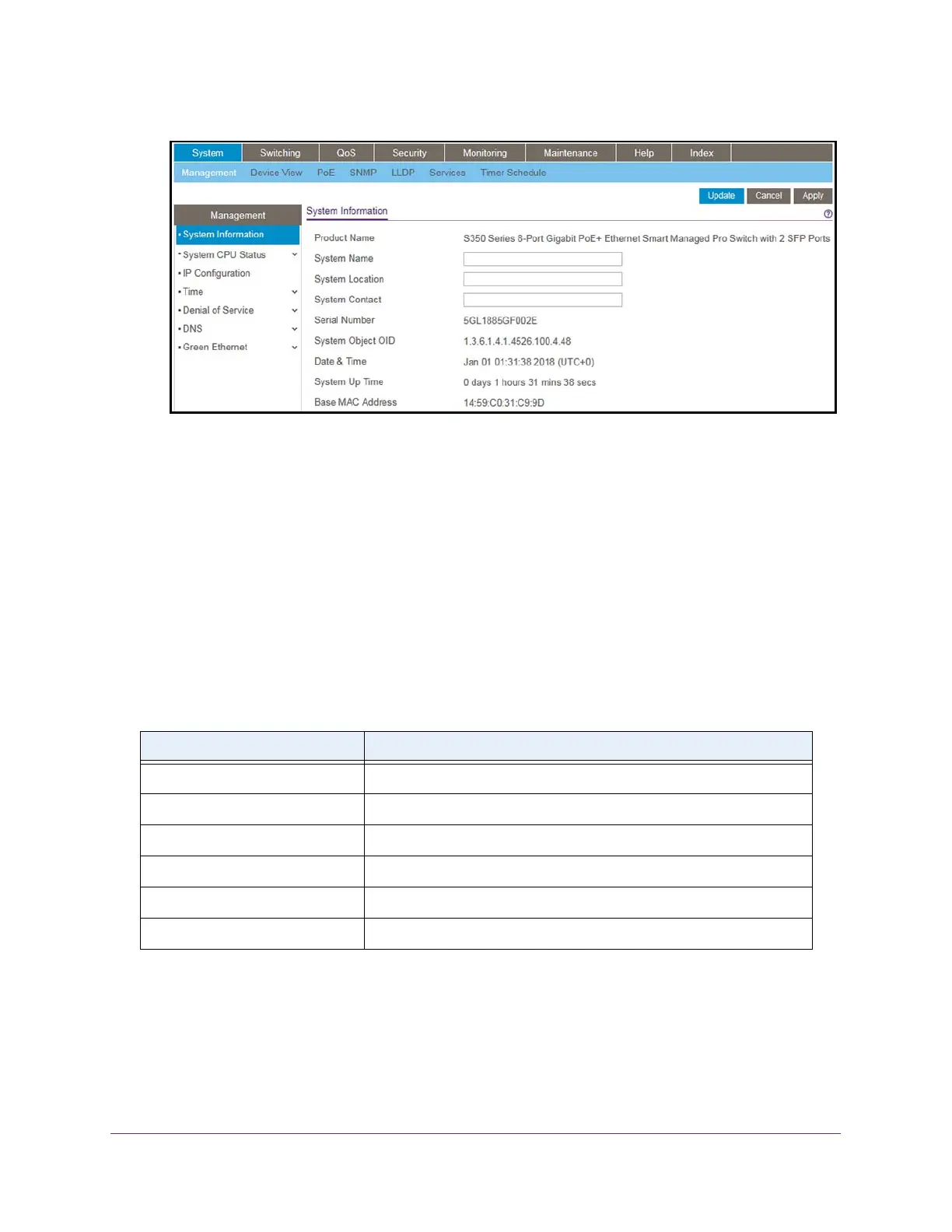 System Up Time The time in days, hours, and minutes since the last switch reboot.