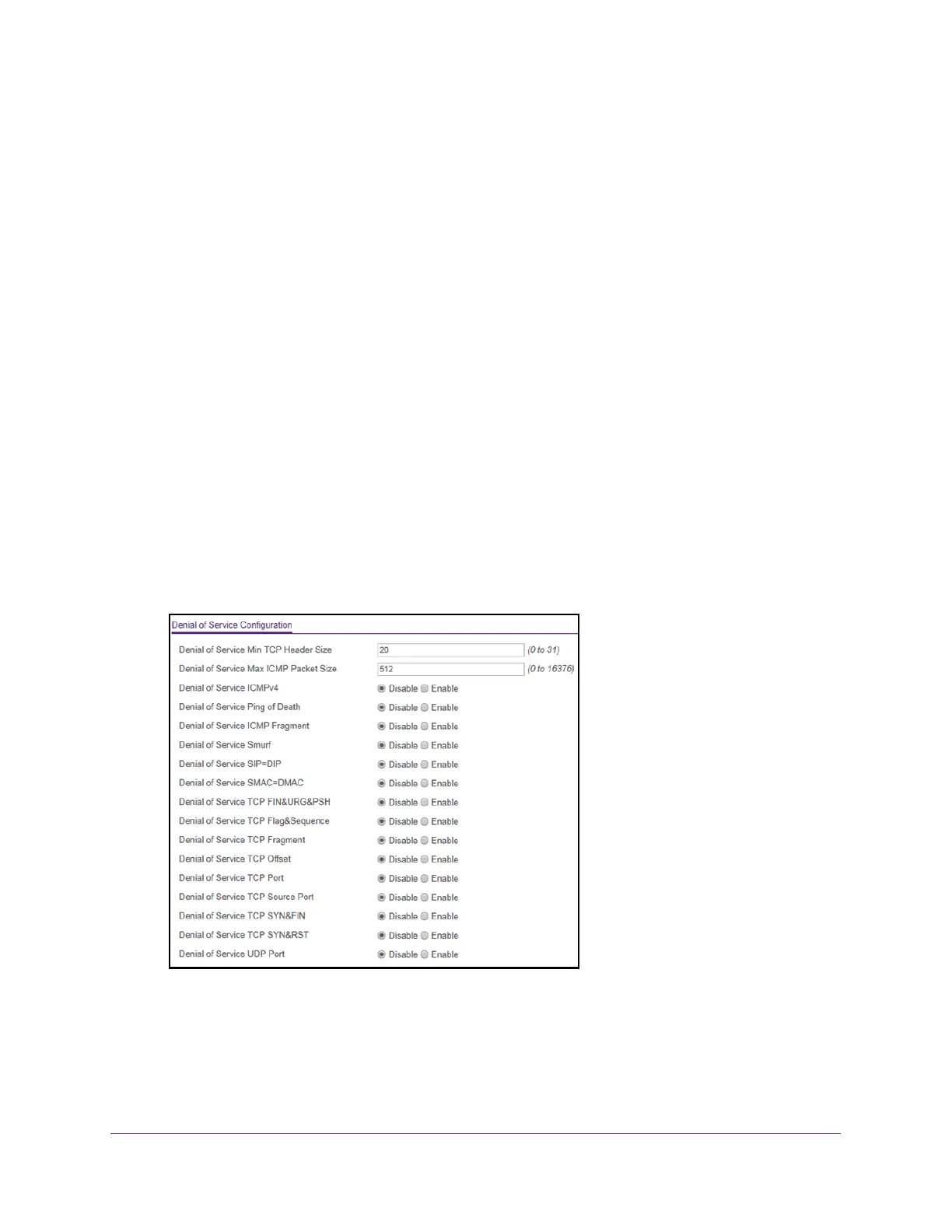 allowed. If DoS TCP Fragment is enabled, the switch drops packets with a TCP