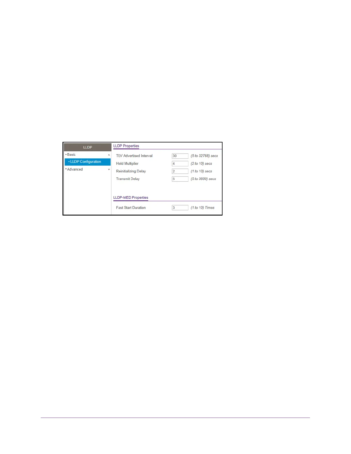 7. To configure a nondefault value for LLDP-MED, enter a value in the Fast Start Duration