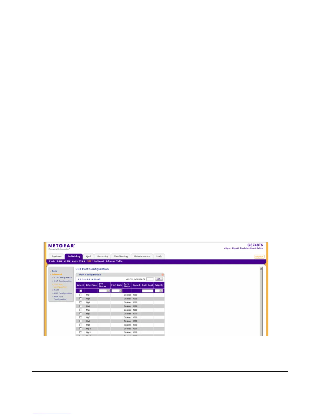 1. Click Switching > STP > Advanced > CST Port Configuration. The CST Port