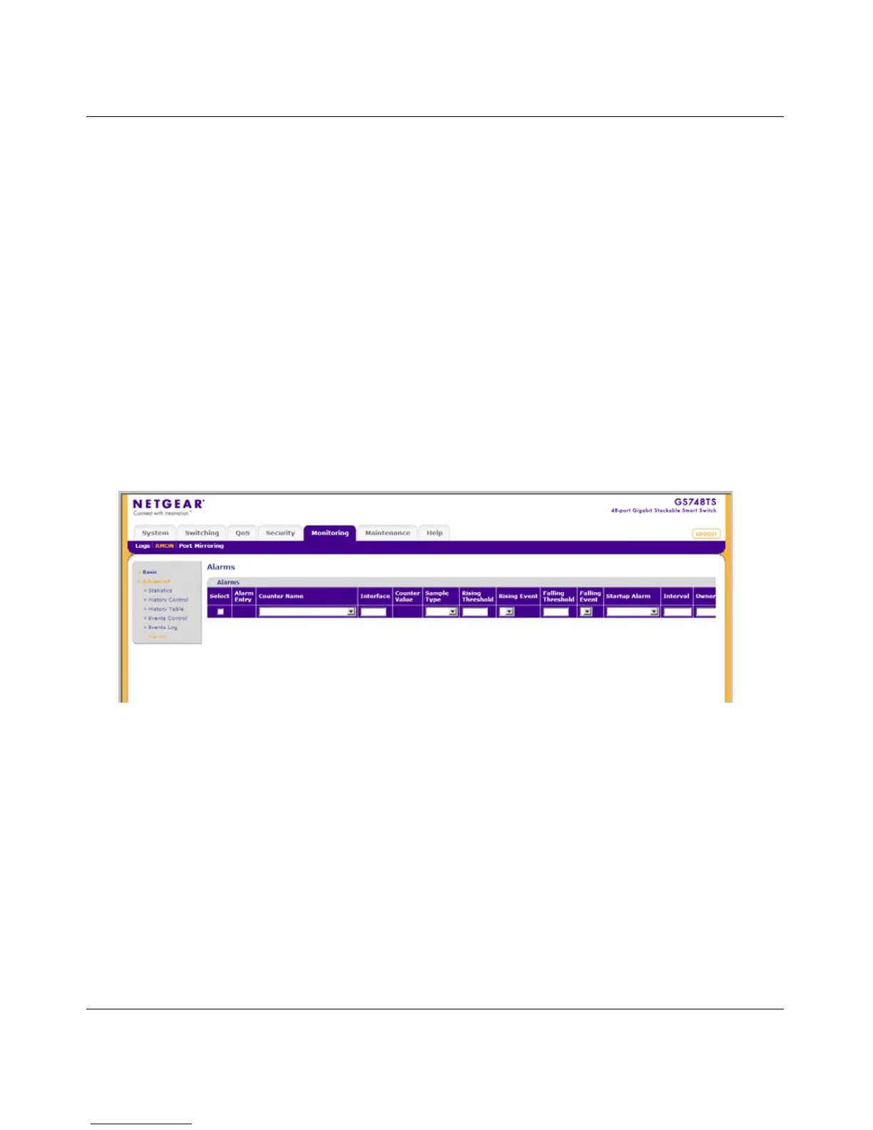 1. Click Monitoring > RMON > Advanced > Alarms. The RMON Alarms screen displays: