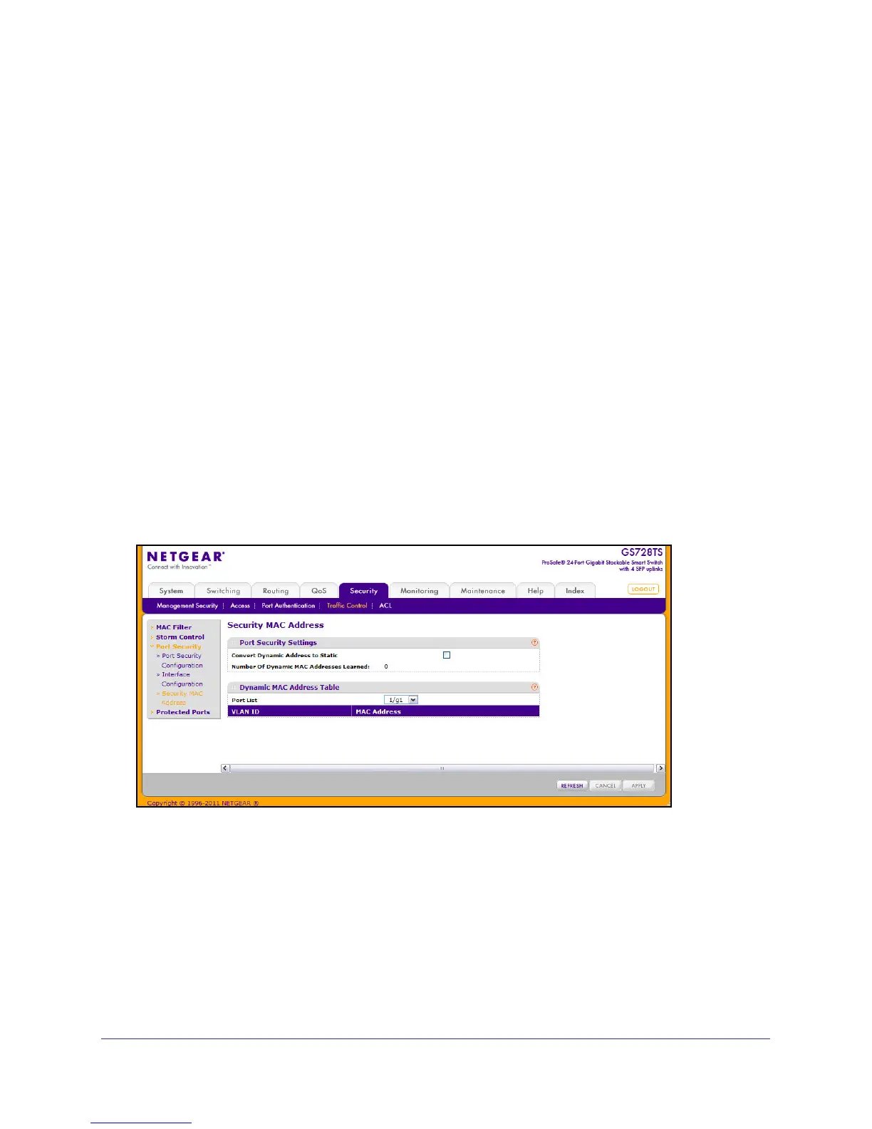 To display the Security MAC Address page, click Security > Traffic Control, and then click the