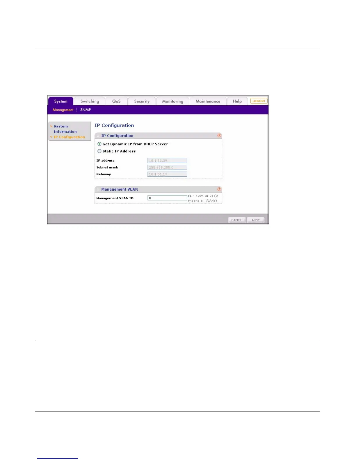 1. Select the System > Management > IP Configuration screen shown below to set your IP