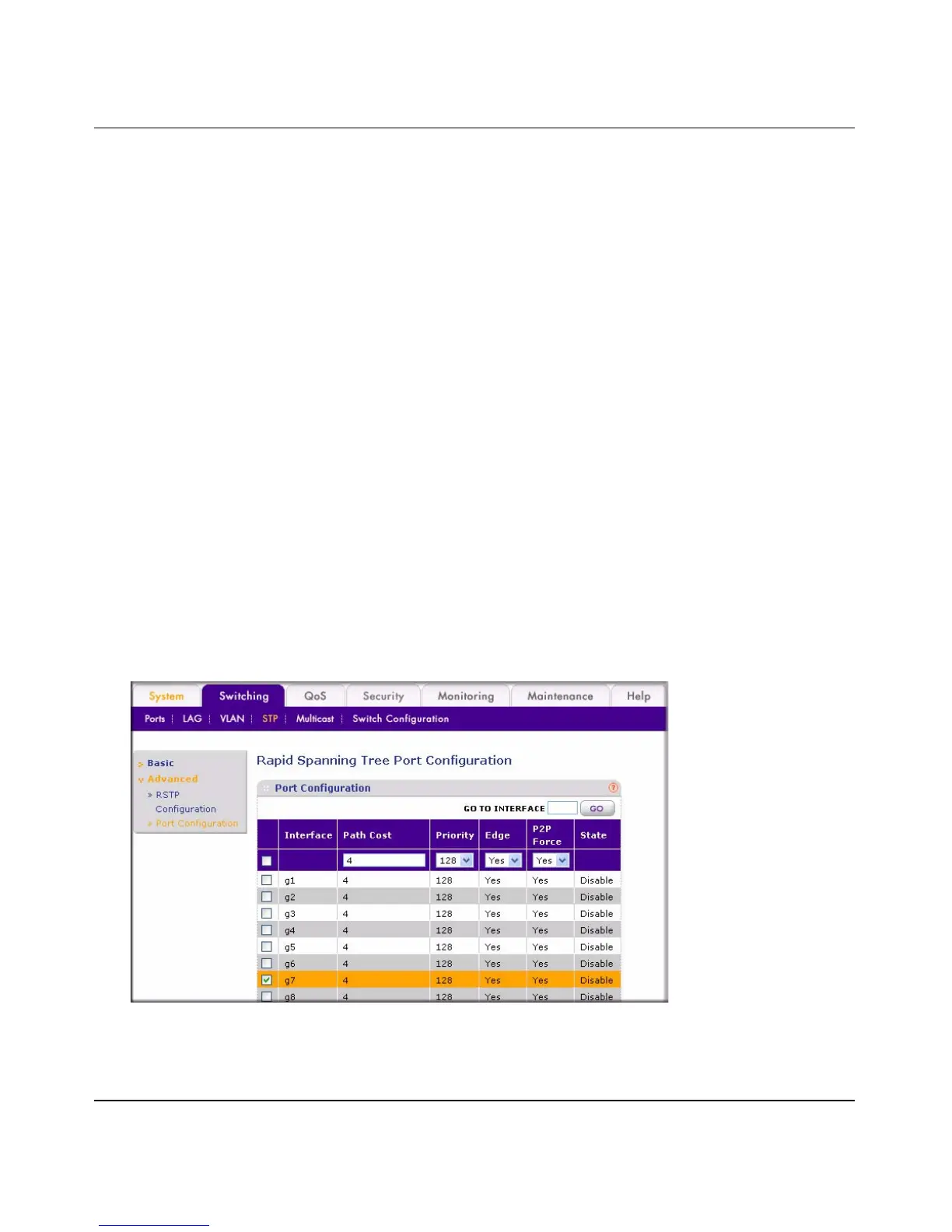 1. Select the Port Configuration link. The RSTP Port Configuration screen will display.