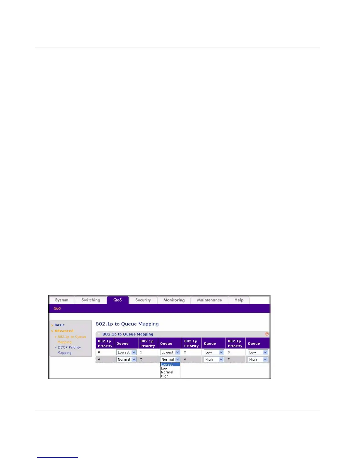 1. Select QoS > Advanced > 802.1p Queue Mapping. The 802.1p to Queue Mapping screen will