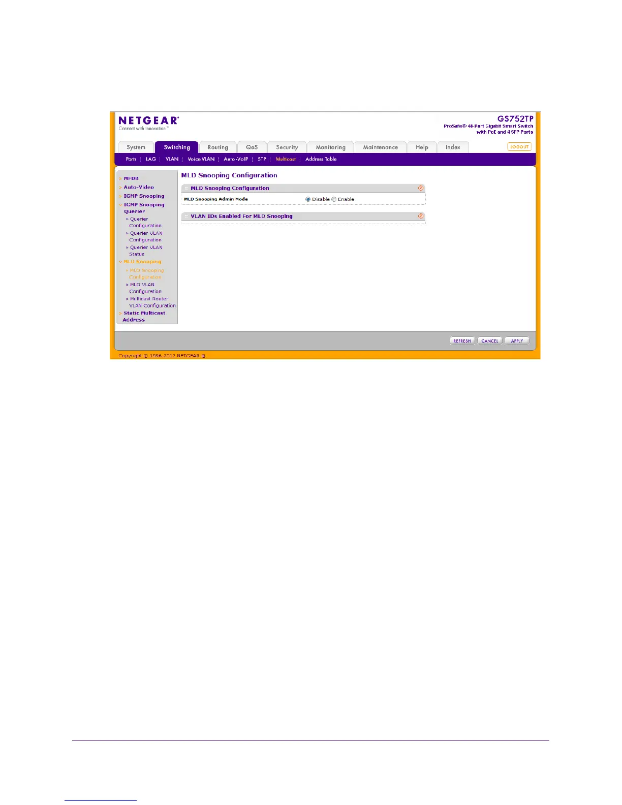 The VLAN IDs Enabled For MLD Snooping section displays VLAN IDs enabled for MLD