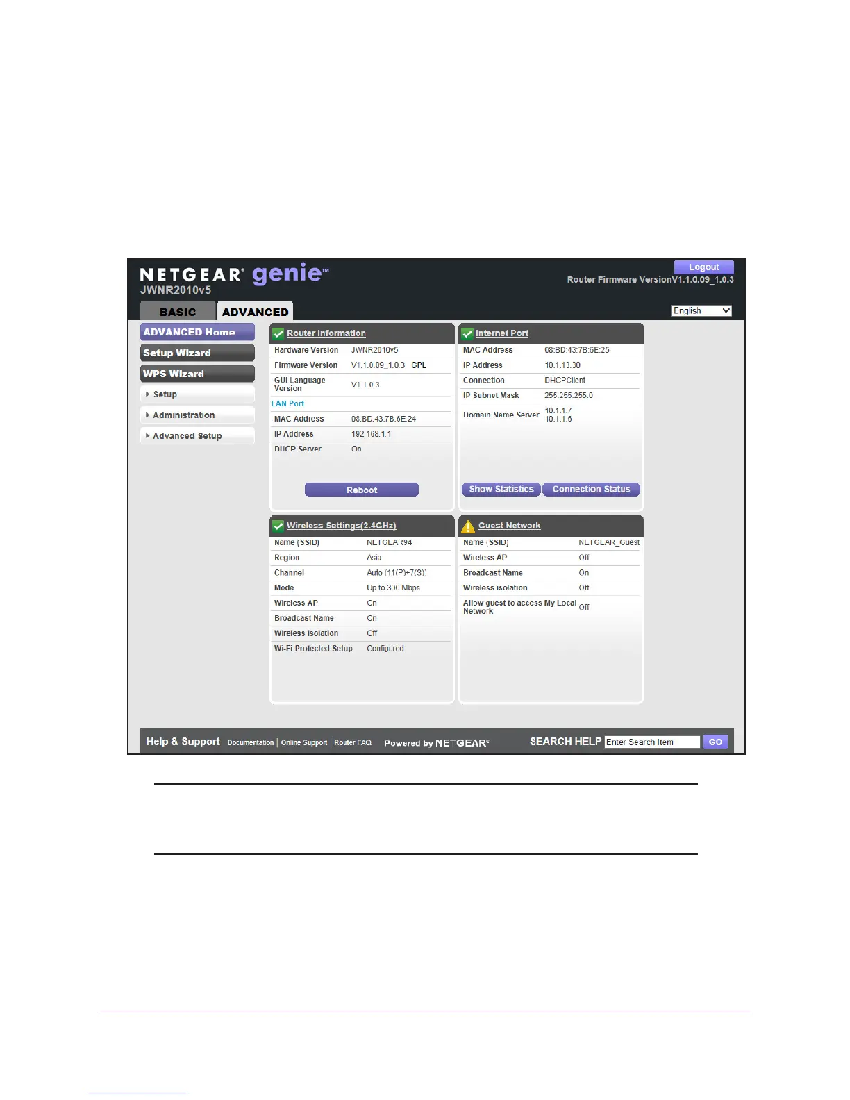 settings, and the guest network (this screen is referred to as the Router Status screen):