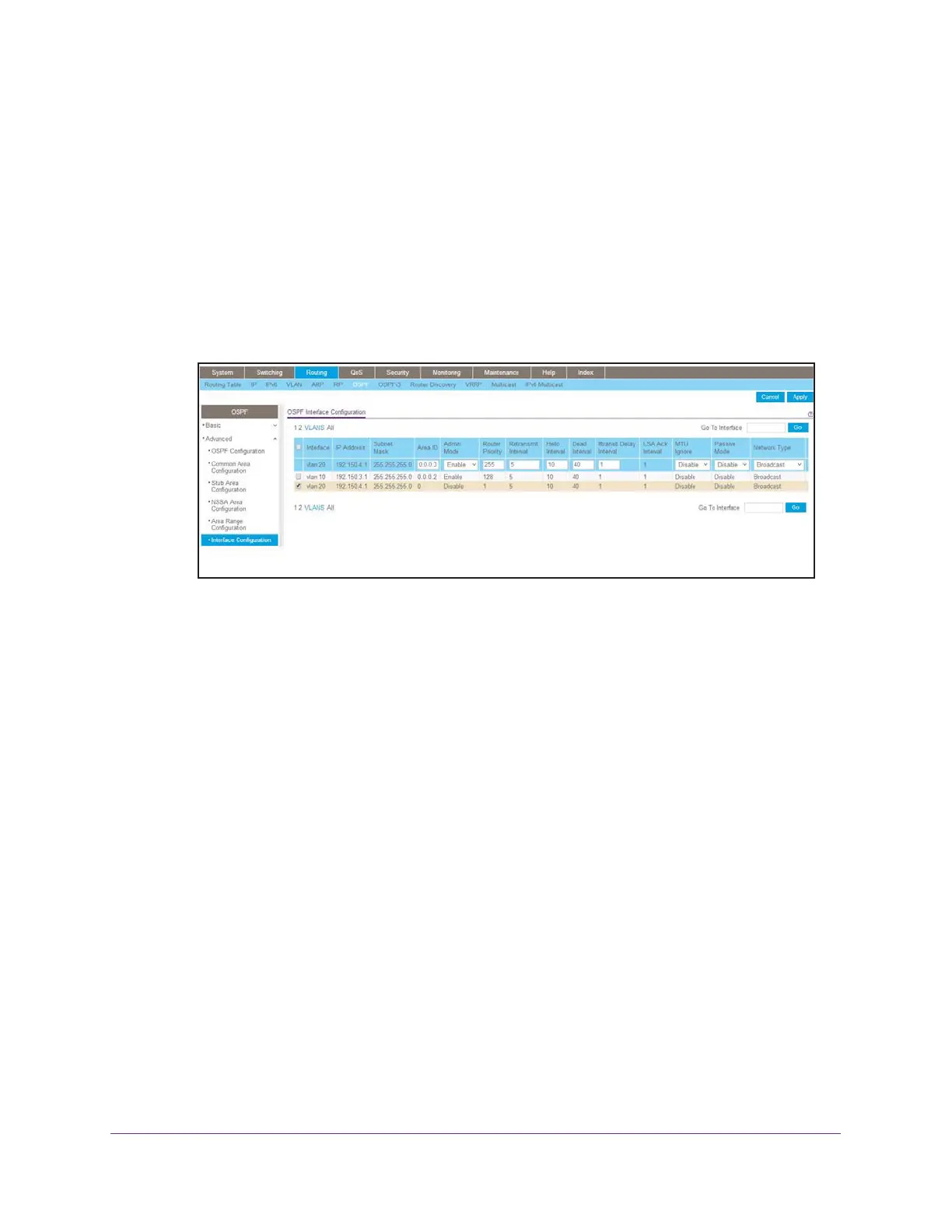a. Select Routing > OSPF > Advanced > Interface Configuration.