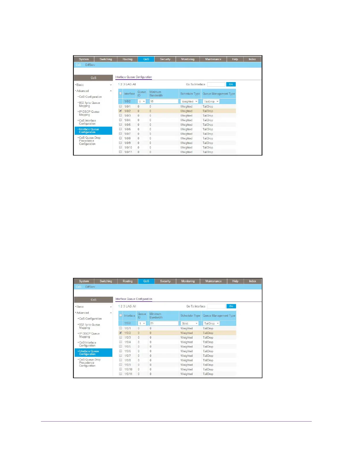 a. Select QoS > CoS > Advanced > Interface Queue Configuration.