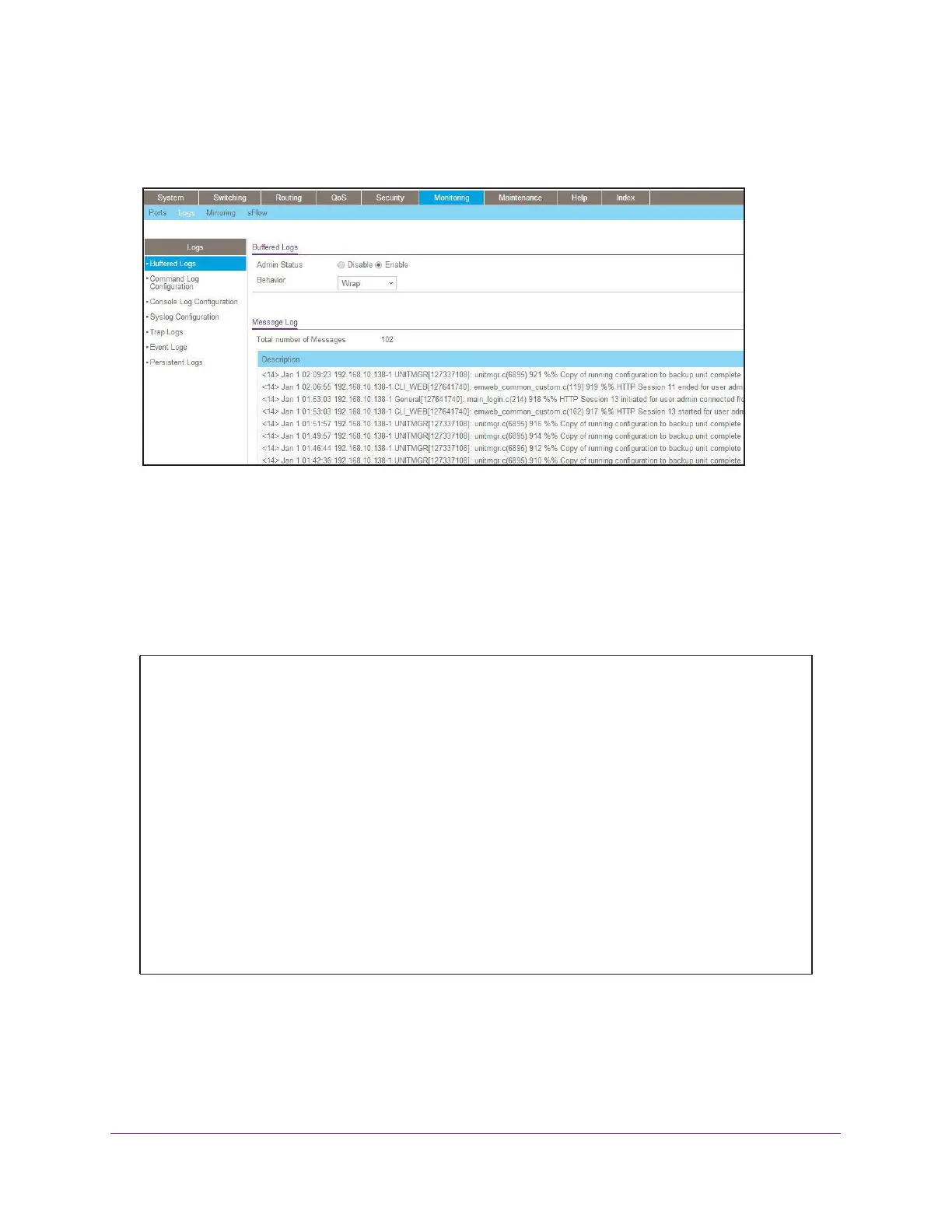 Select Monitoring > Logs > Buffer Logs. A screen similar to the following displays.