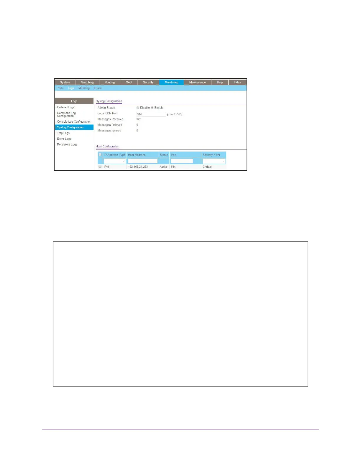 (Netgear Switch) (Config)#logging host 192.168.21.253 ?
