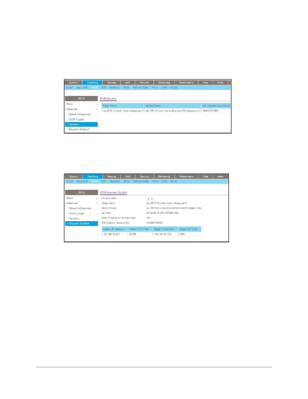 a. Select Switching > iSCSI > Advanced > Sessions detailed.