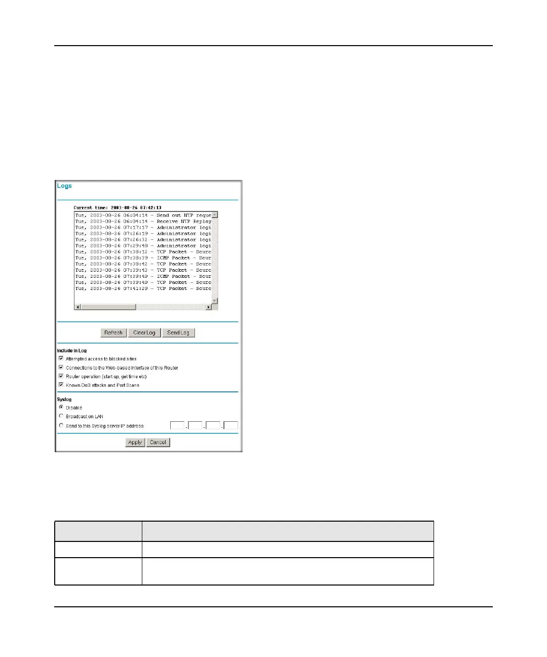 The router logs security-related events such as denied incoming service requests, hacker probes,