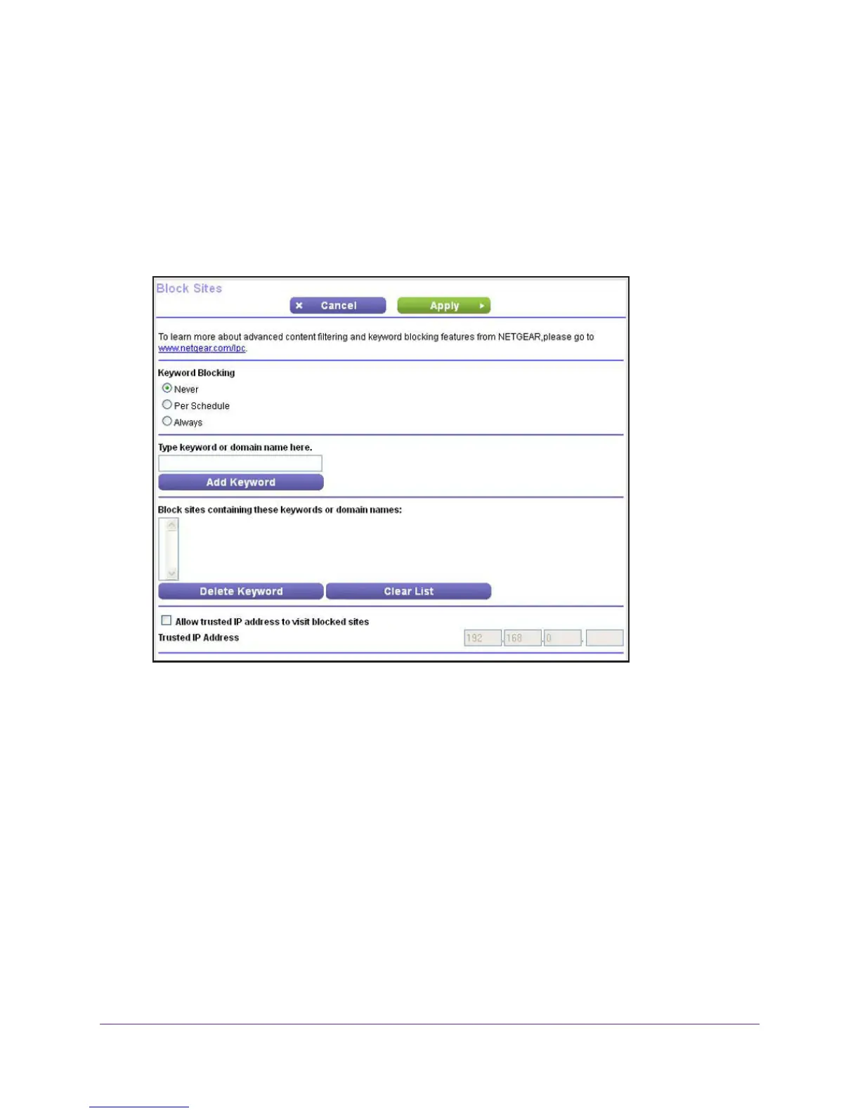 • Per Schedule. Turn on keyword blocking according to the Schedule screen settings.