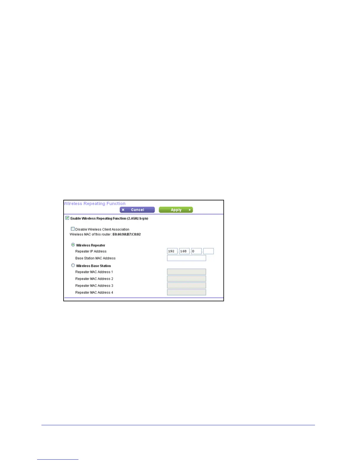 • Enable Wireless Repeating Function (2.4 GHz b/g/n). Select this check box to use the