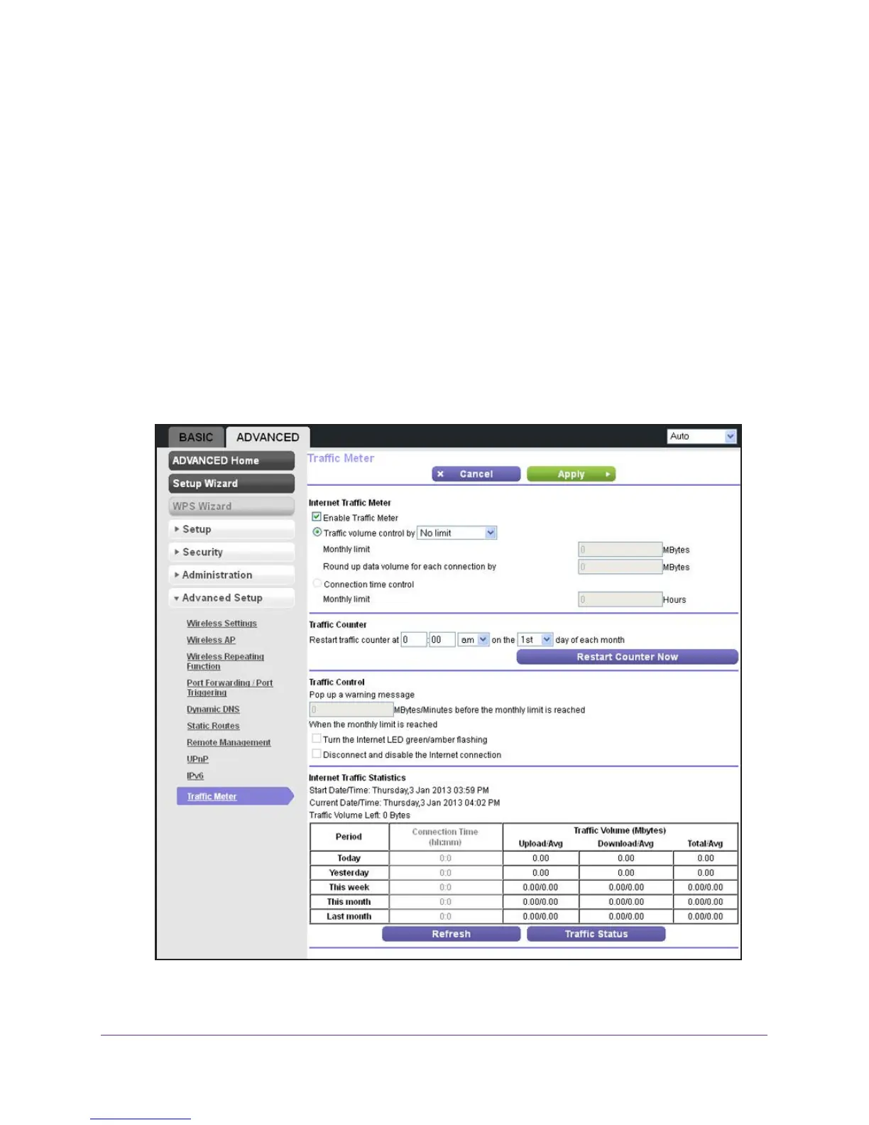 router’s Internet port. With the traffic meter utility, you can set limits for traffic volume, set a