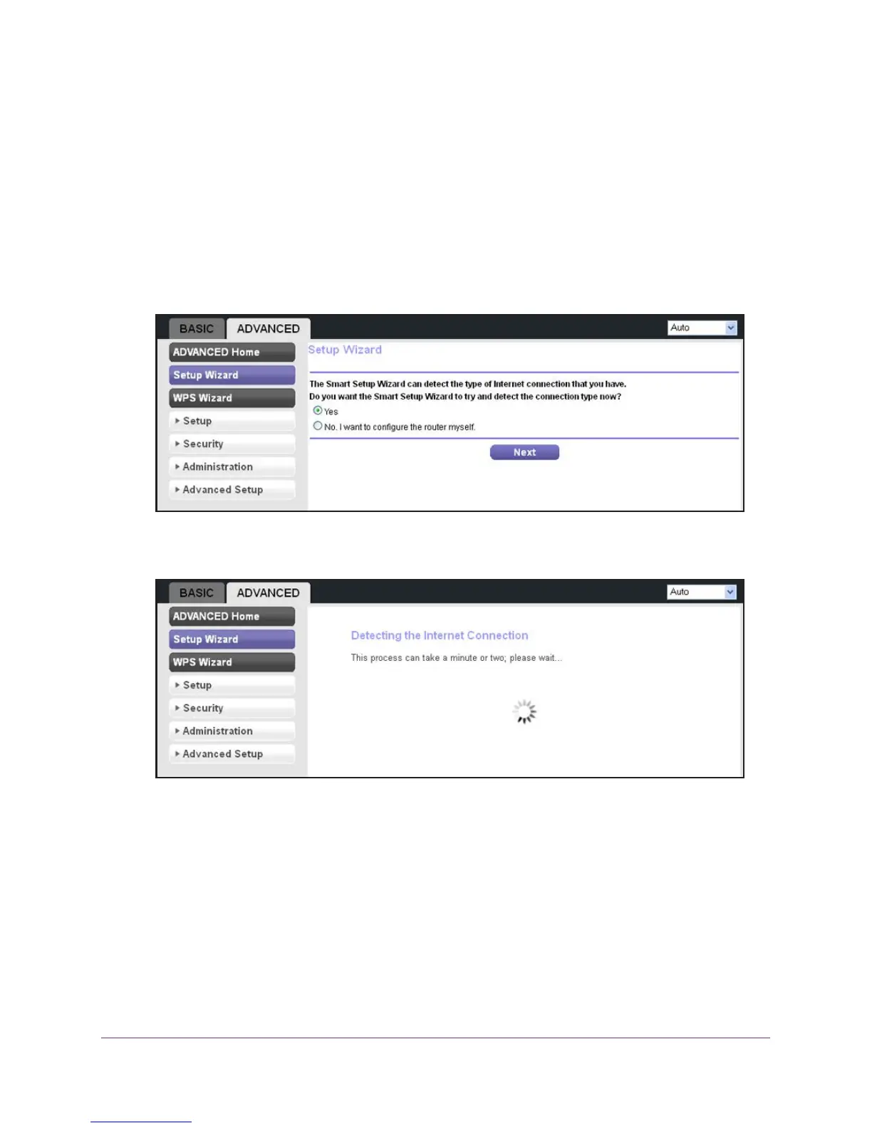The NETGEAR genie installation process is launched with the Setup Wizard the first time that
