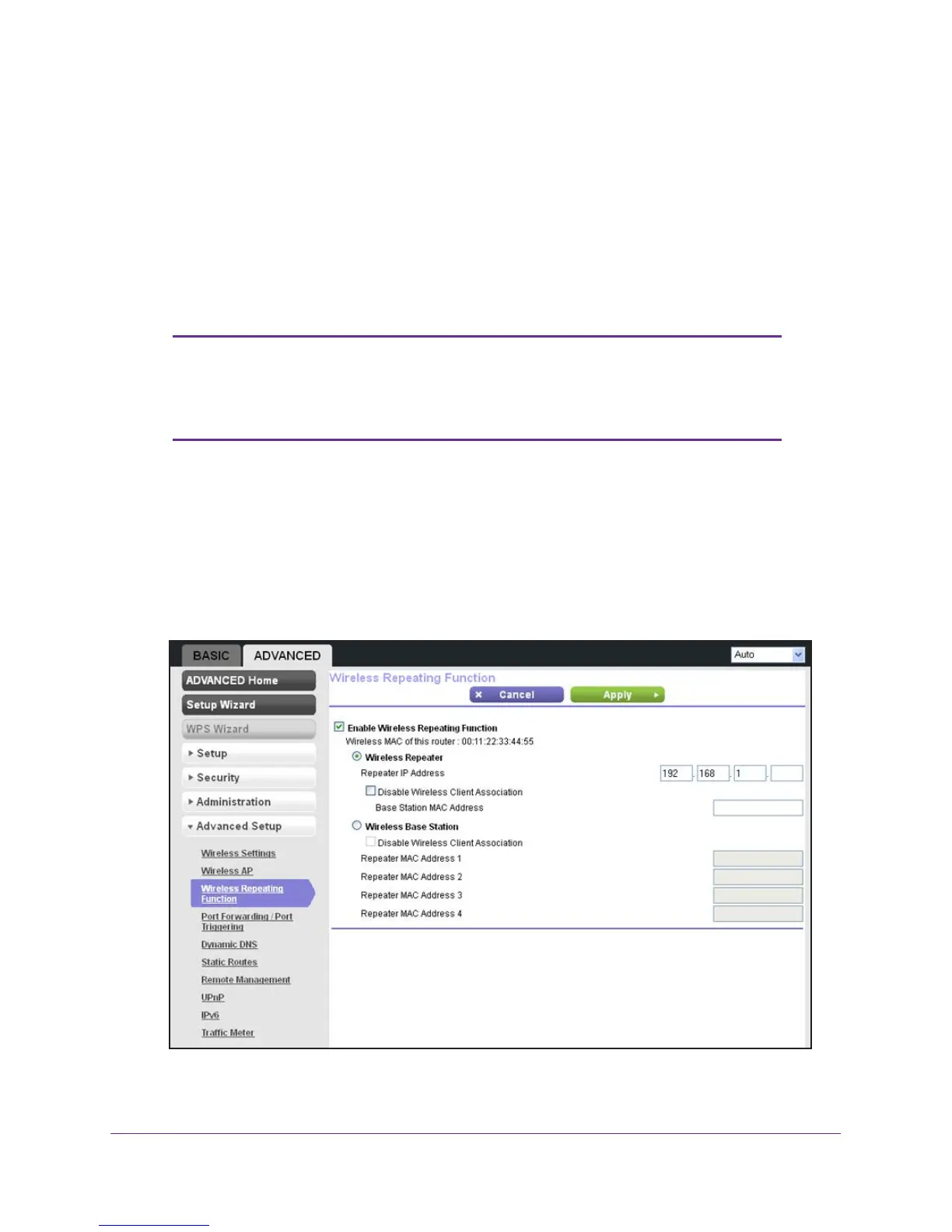 The Wireless Repeating Function screen displays. The wireless MAC address of the