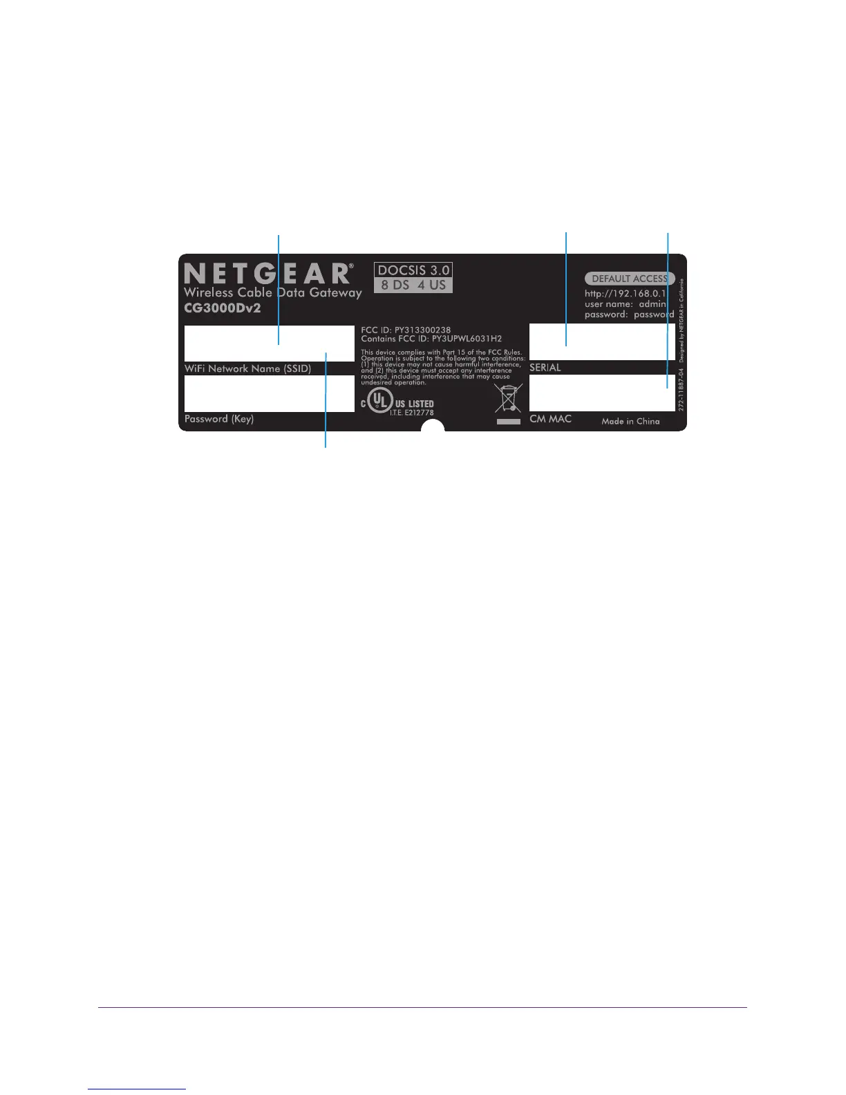 The label on the modem router shows the router’s WiFi network name (SSID), password,
