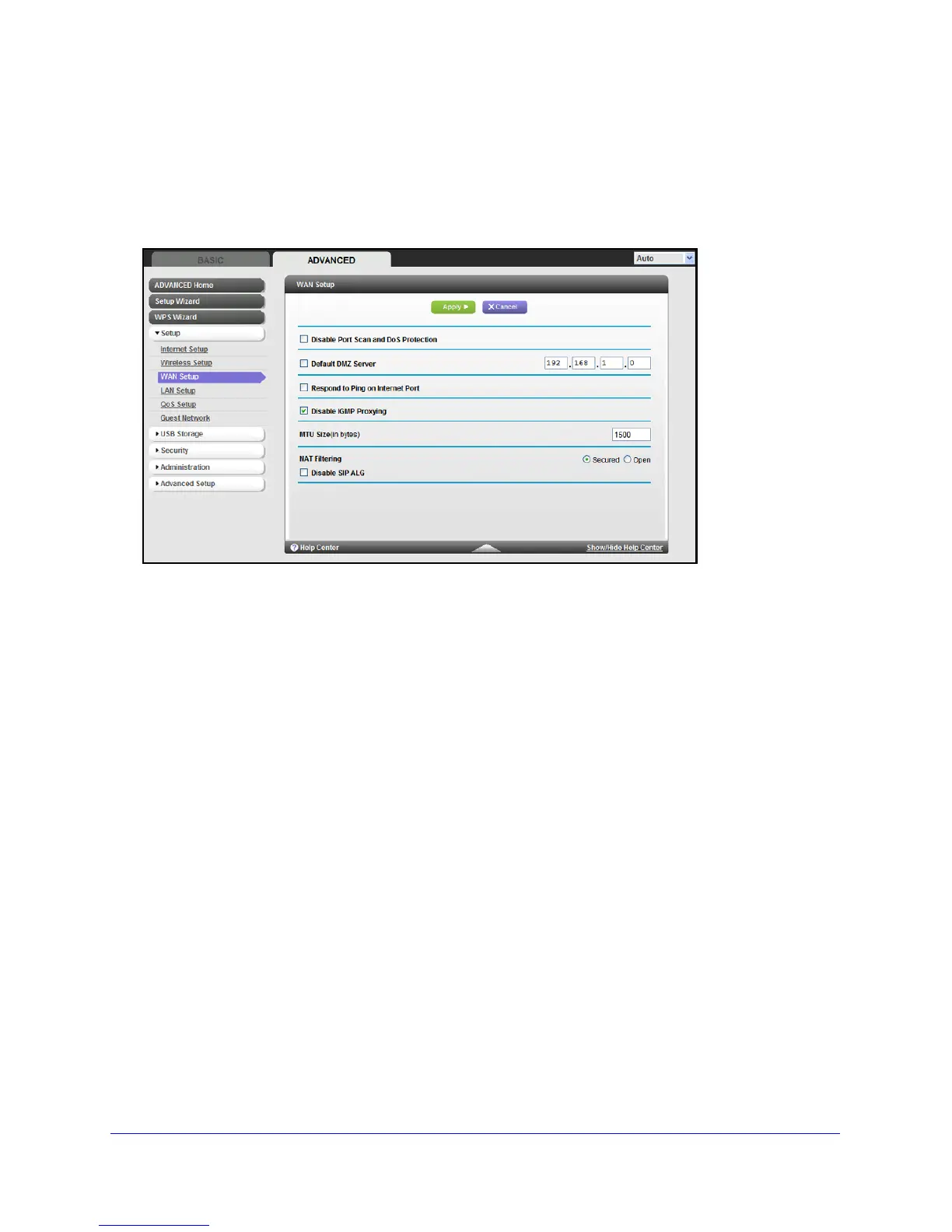 (Internet) port. Select Advanced > Setup > WAN Setup to view the following screen: