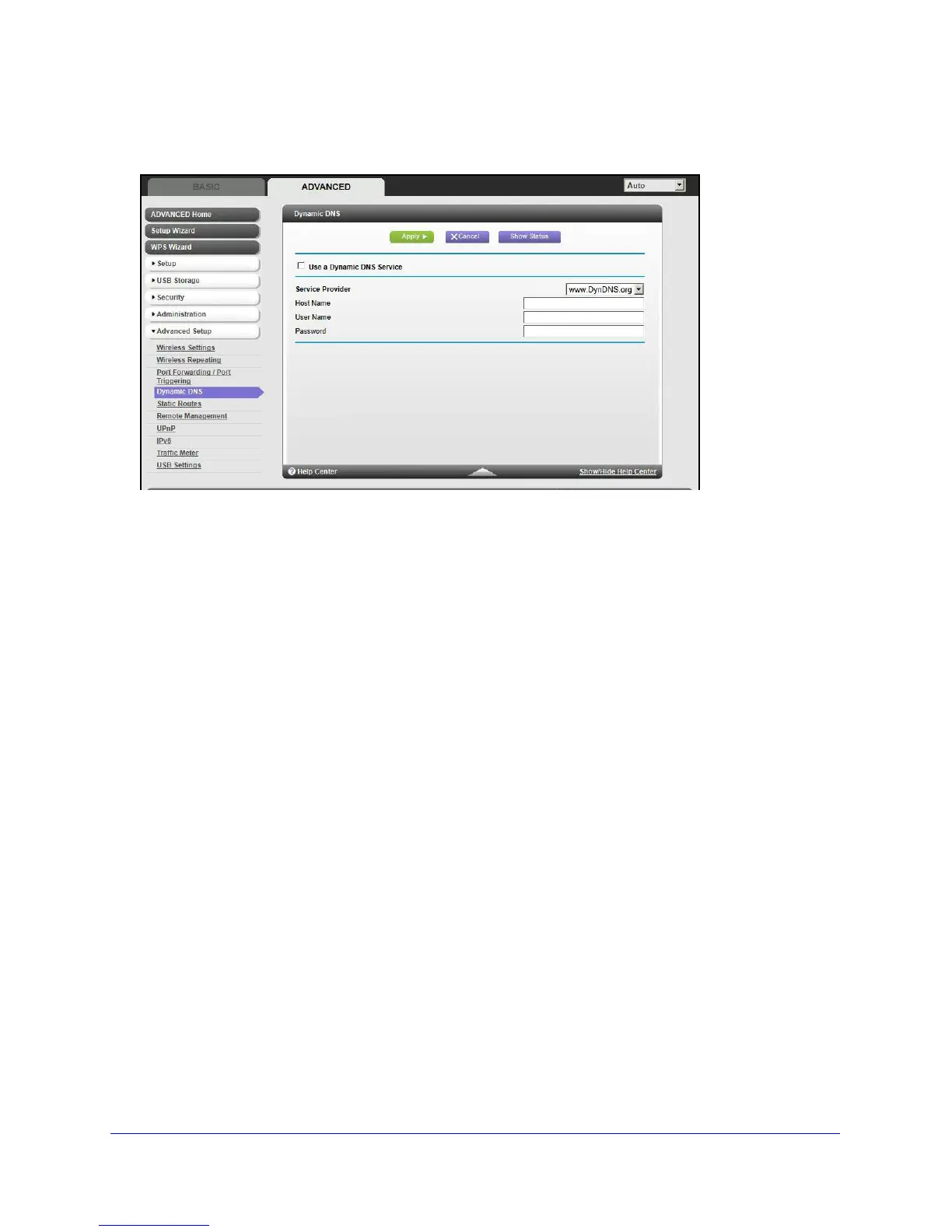 On the Advanced tab, select Advanced Setup > Dynamic DNS to display the following