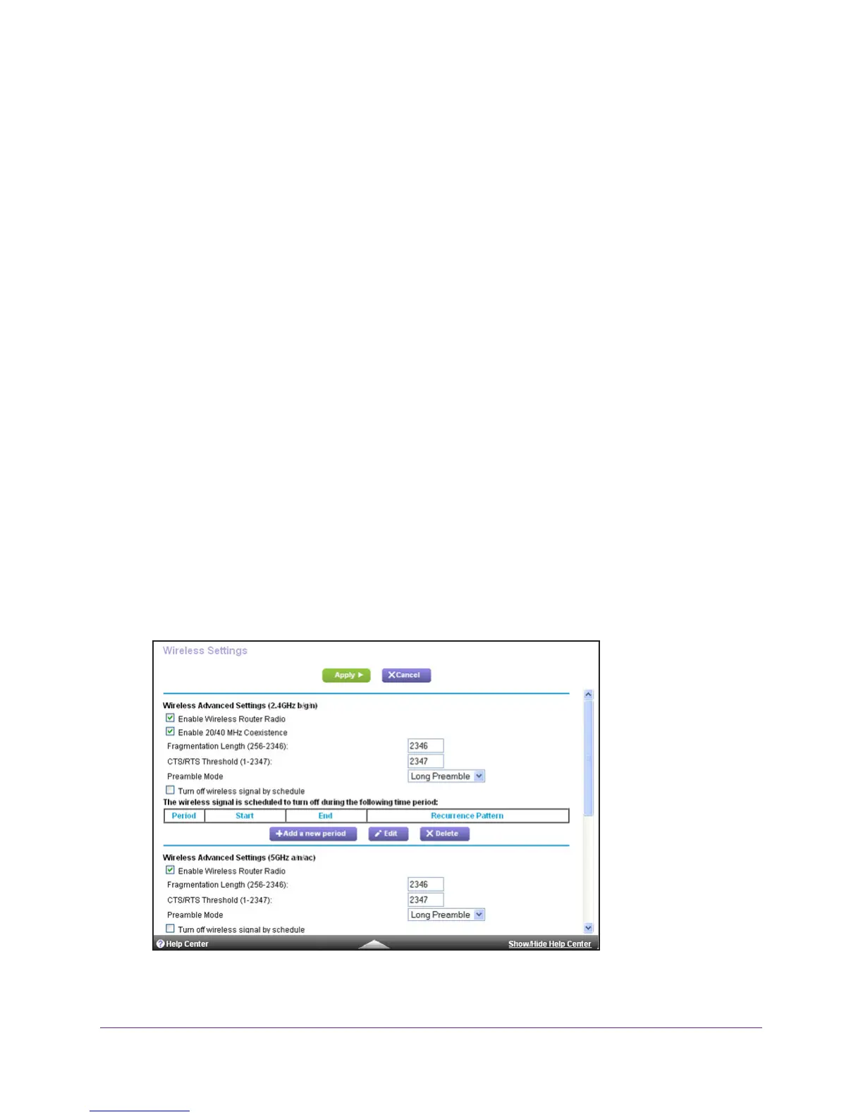 5. In the 2.4 GHz and 5 GHz sections of the screen, select or clear the Enable Wireless