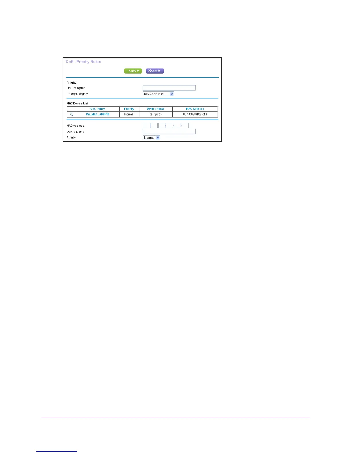 The information from the MAC Device List populates the QoS Policy for, MAC Address,