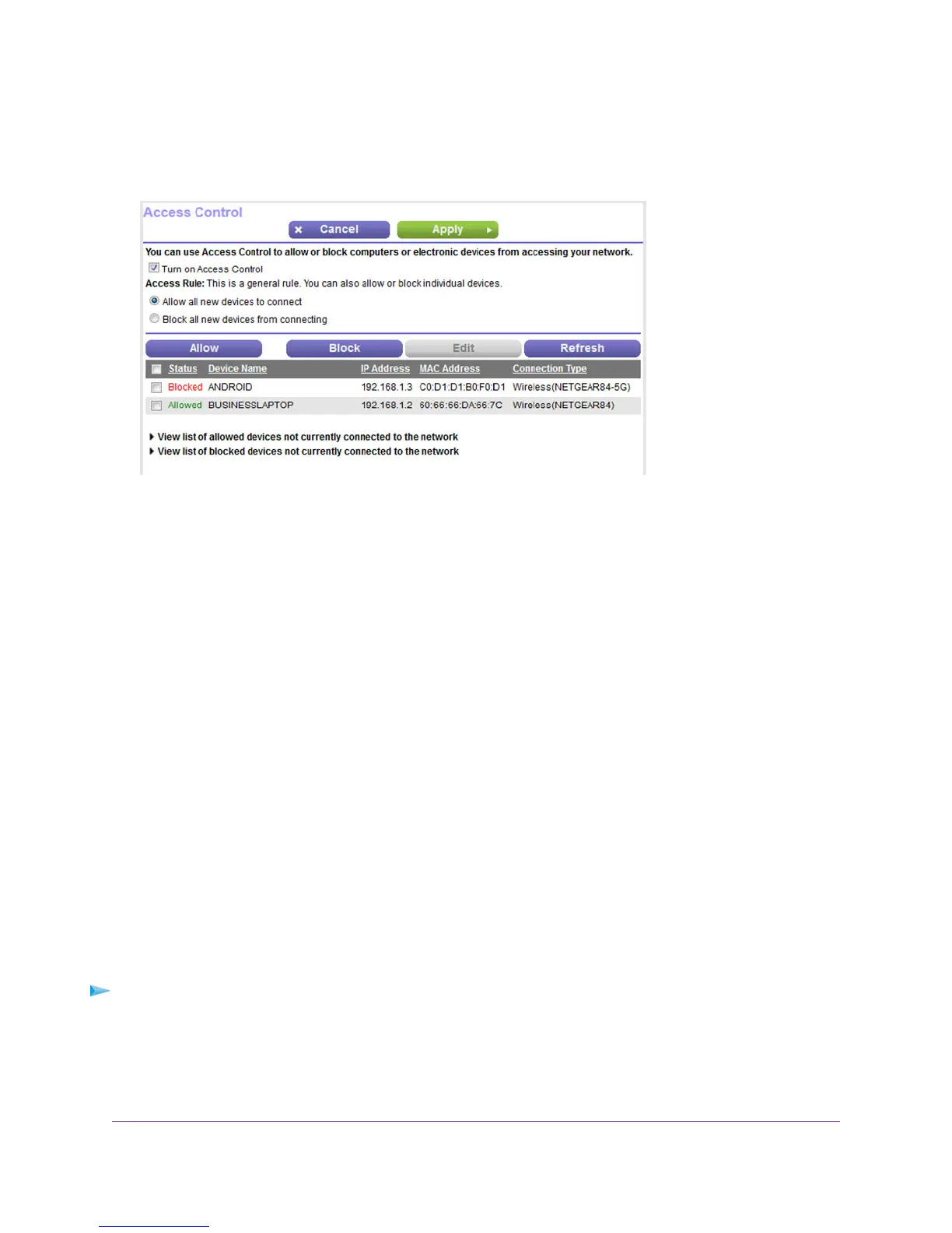 MAC addresses of wired and WiFi devices that can either access your entire network or are blocked from accessing
