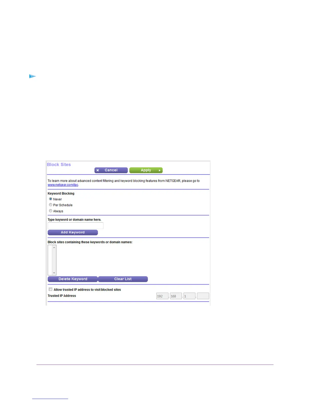 • Per Schedule. Use keyword blocking according to a schedule that you set.