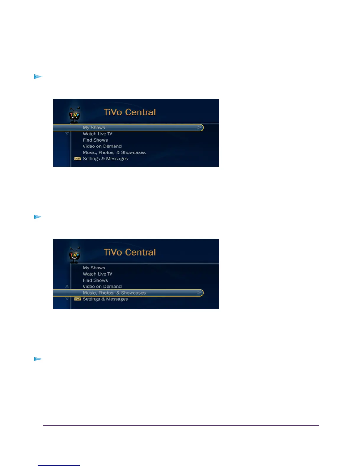 1. On the TiVo, select TiVo Central > Music, Photos, & Showcases.