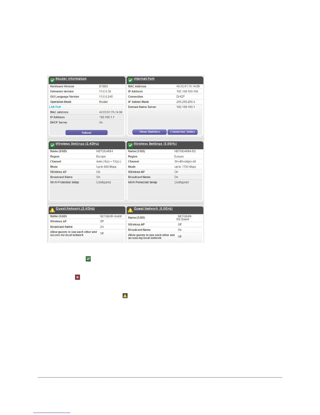 A red X indicates that configuration problems exist for the cable connection or Internet connection or the